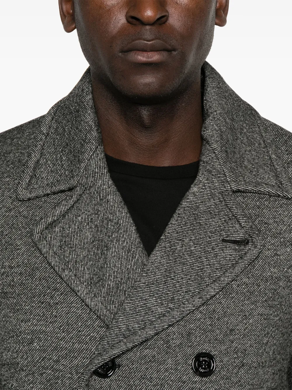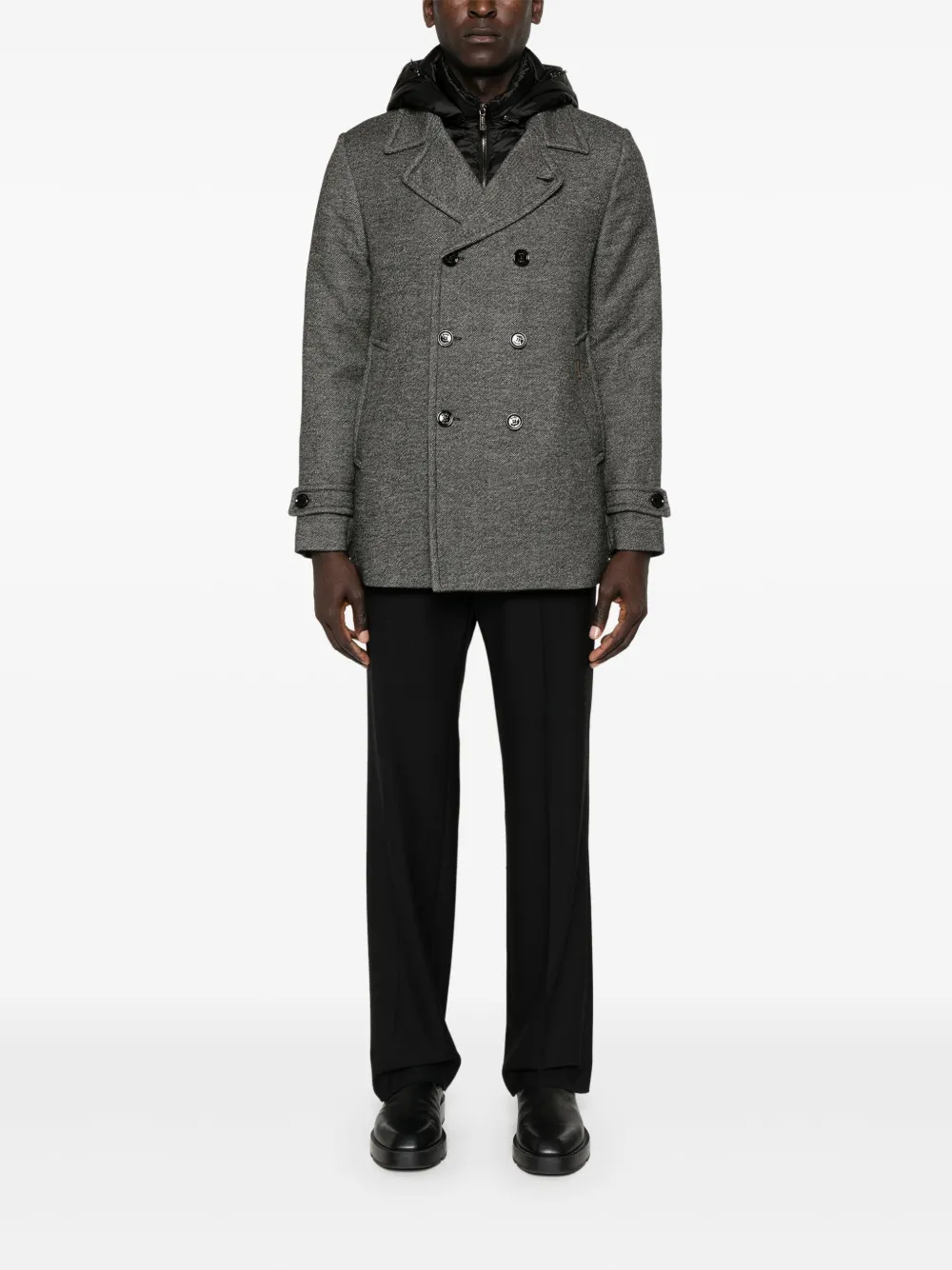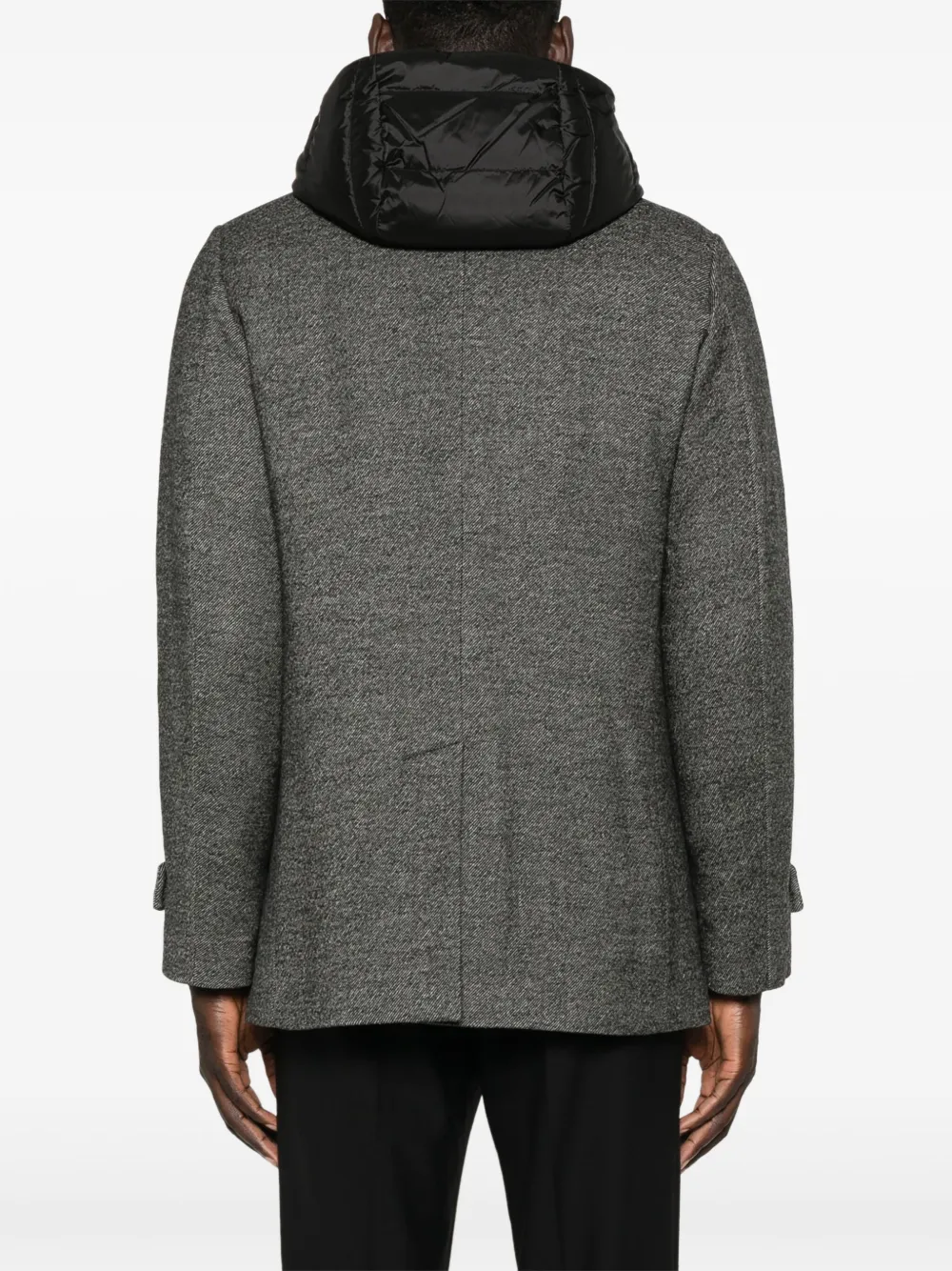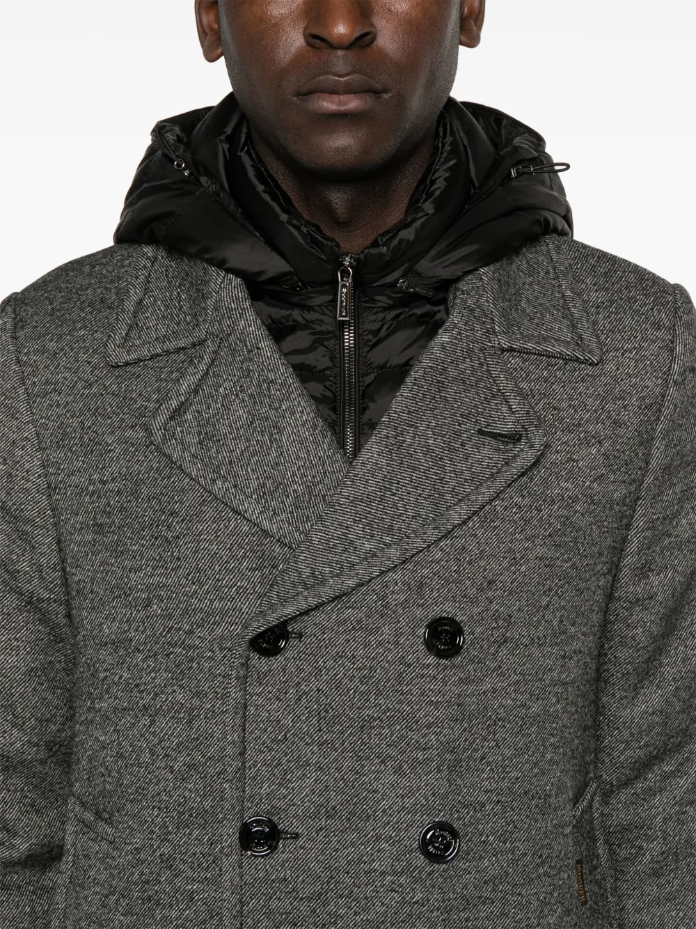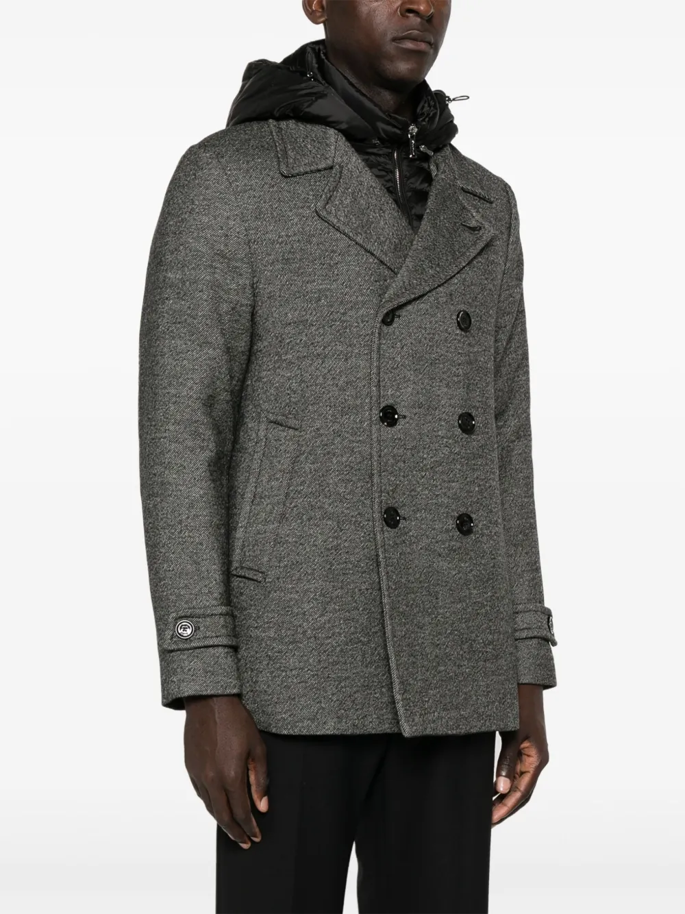 Подробнее о товаре: • серый • вирджинская шерсть • эффект меланж • стеганная модель • ткань с твиловым переплетением • наполнитель из смеси пуха и пера • многослойная деталь • съемный капюшон • зазубренные лацканы • длинные рукава с манжетами на пуговицах • два прорезных кармана сбоку • цельная подкладка • центральная шлица на пуговицах сзади • прямой подол • двубортная застежка на пуговицы