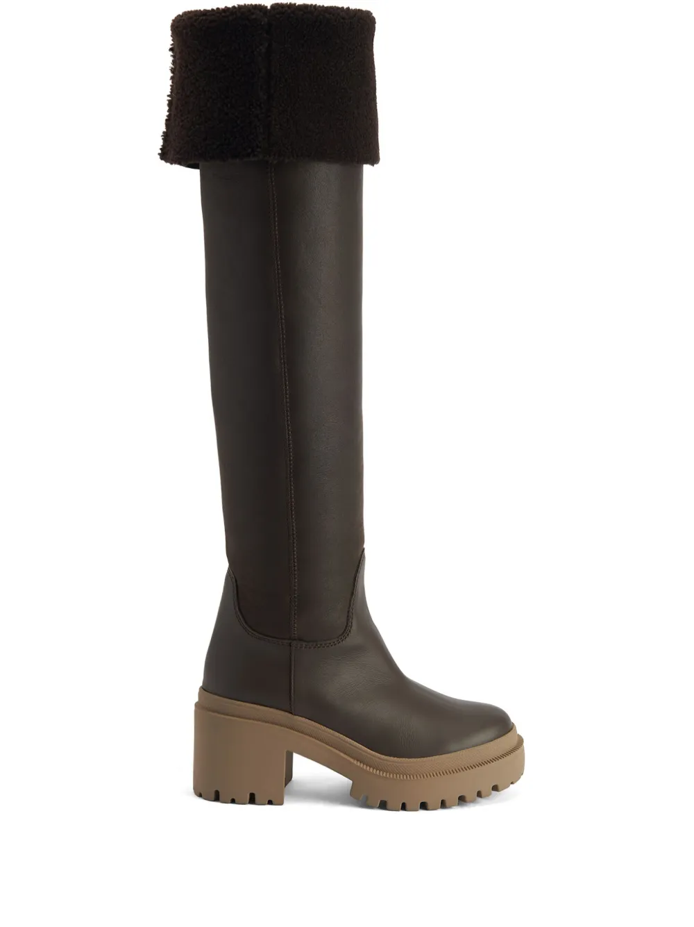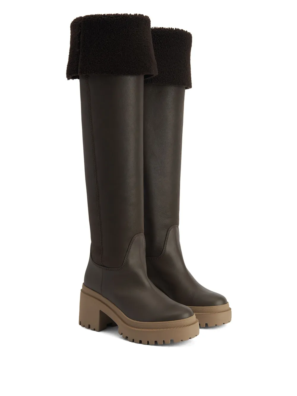 Коричневый, кожа, подкладка из овечьей шерсти, модель без застежки, закругленный носок, массивная резиновая подошва, высота по колено и высокий блочный каблук.