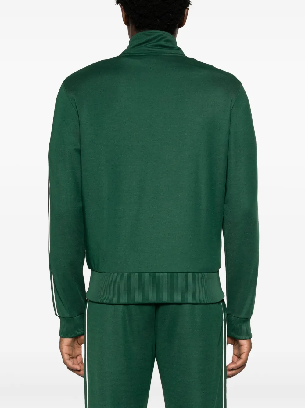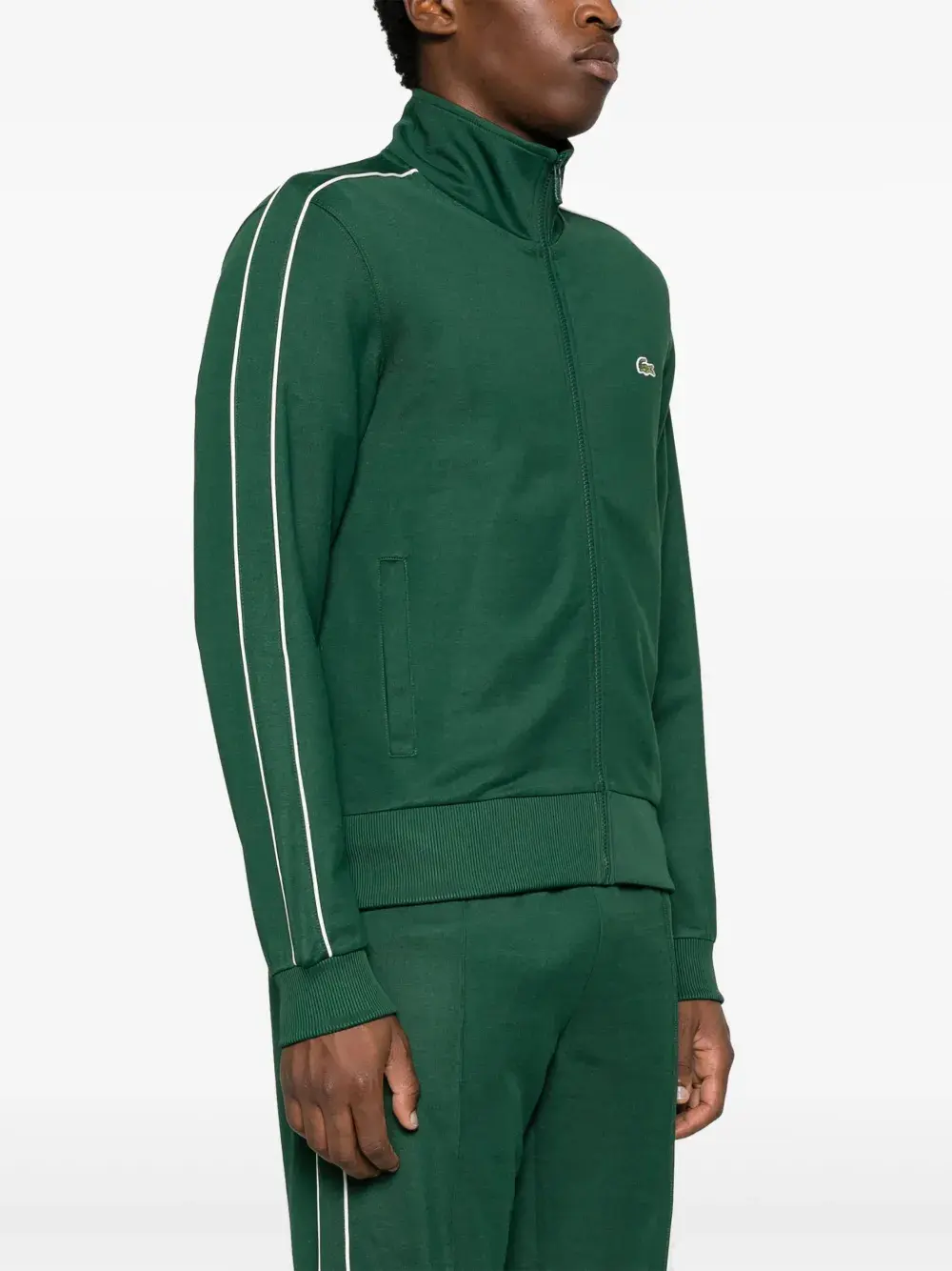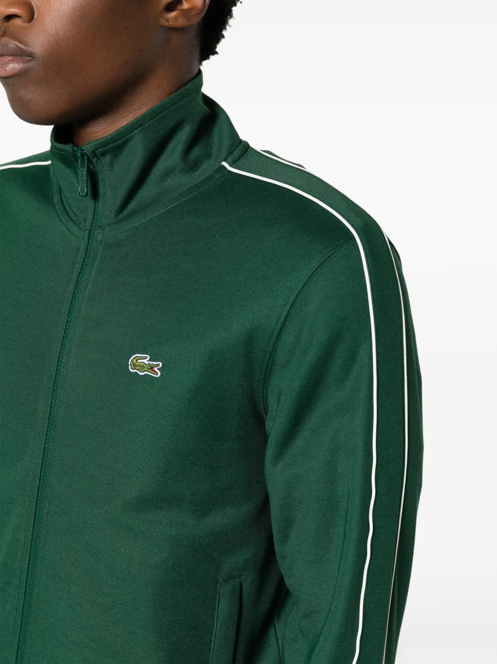 Насыщенный зеленый, белый, ткань пике, объемная окантовка, нашивка с логотипом на груди, высокий воротник, застежка на молнии спереди, длинные рукава и прямой подол.