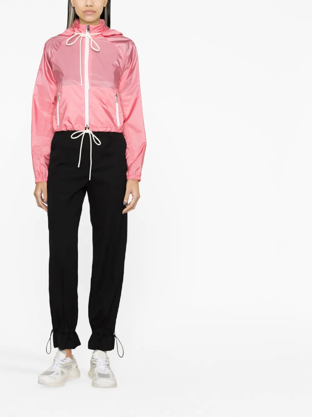 Расцветка Blush Pink, нашивка с логотипом на рукаве, двусторонняя молния спереди, затягивающийся на шнурок капюшон, передние карманы на молнии, длинные рукава, прямой подол и подол с кулиской.