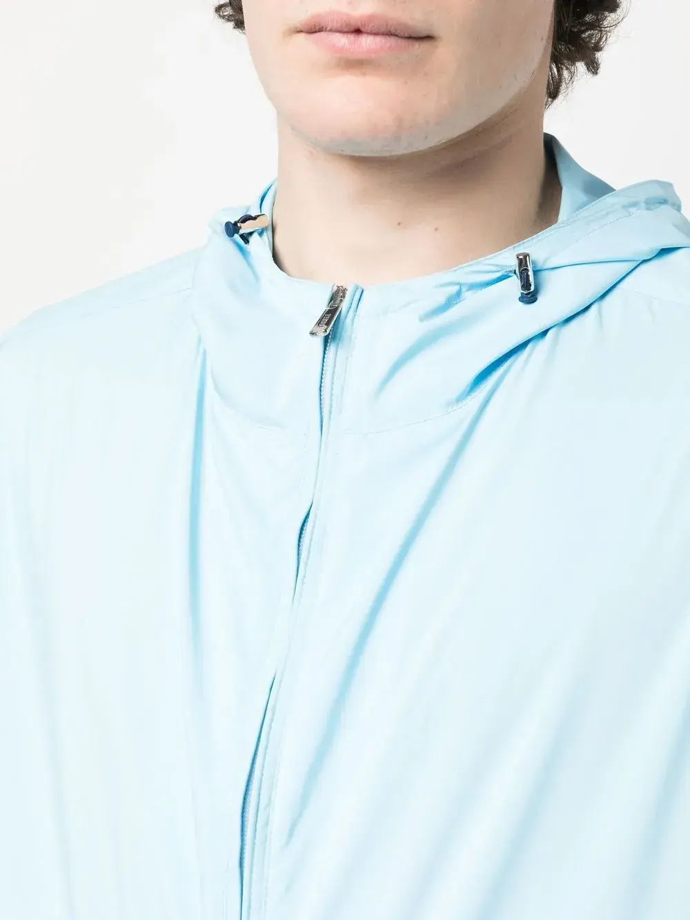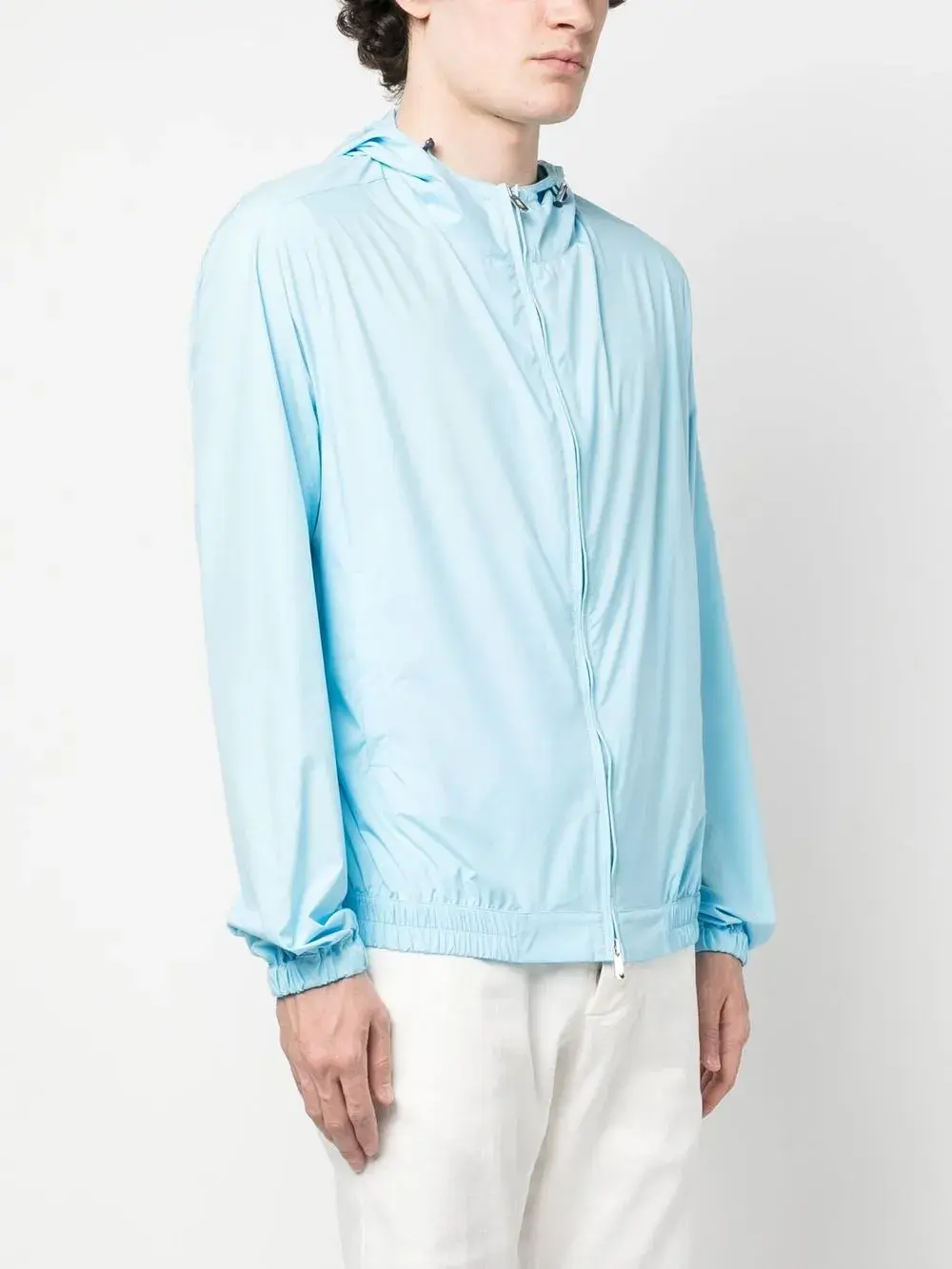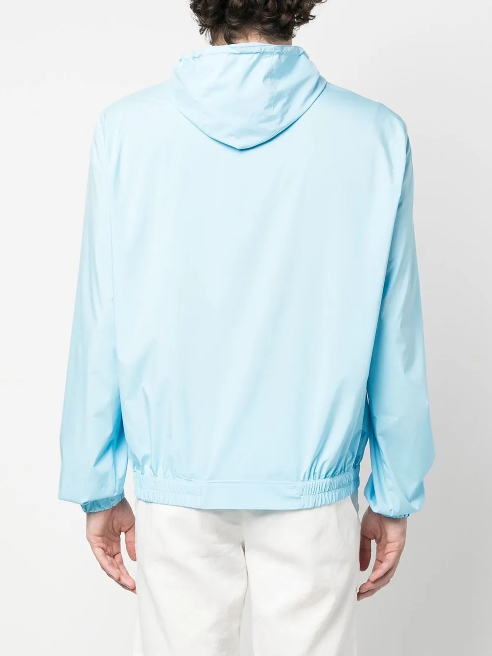 Голубой, затягивающийся на шнурок капюшон, застежка на молнии спереди, рукава с манжетами, эластичные манжеты, эластичный подол и прямой подол.