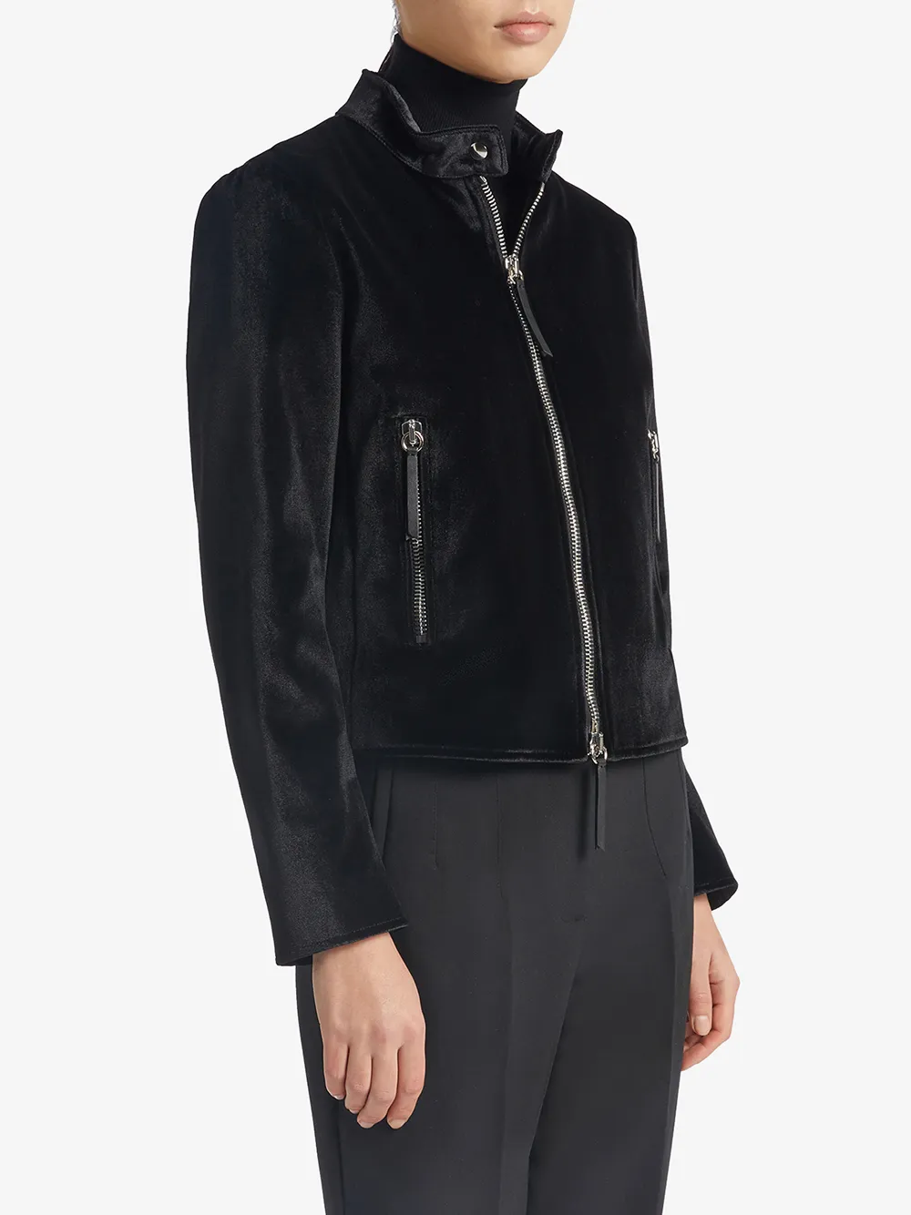 Высокий воротник, застежка на молнии спереди, передние карманы на молнии, длинные рукава и прямой подол. Цвет: черный.