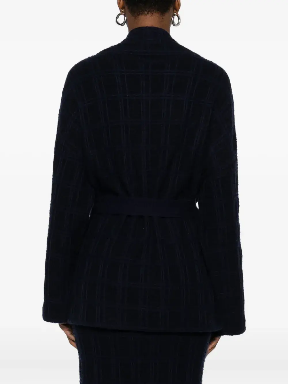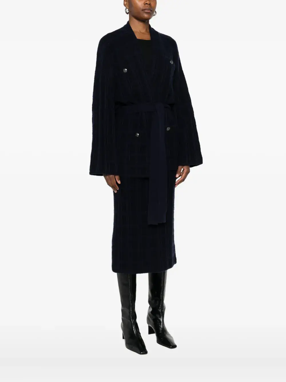 Темно-синий жаккардовый твидовый узор, накладные карманы, вязаный пояс, длинные рукава.