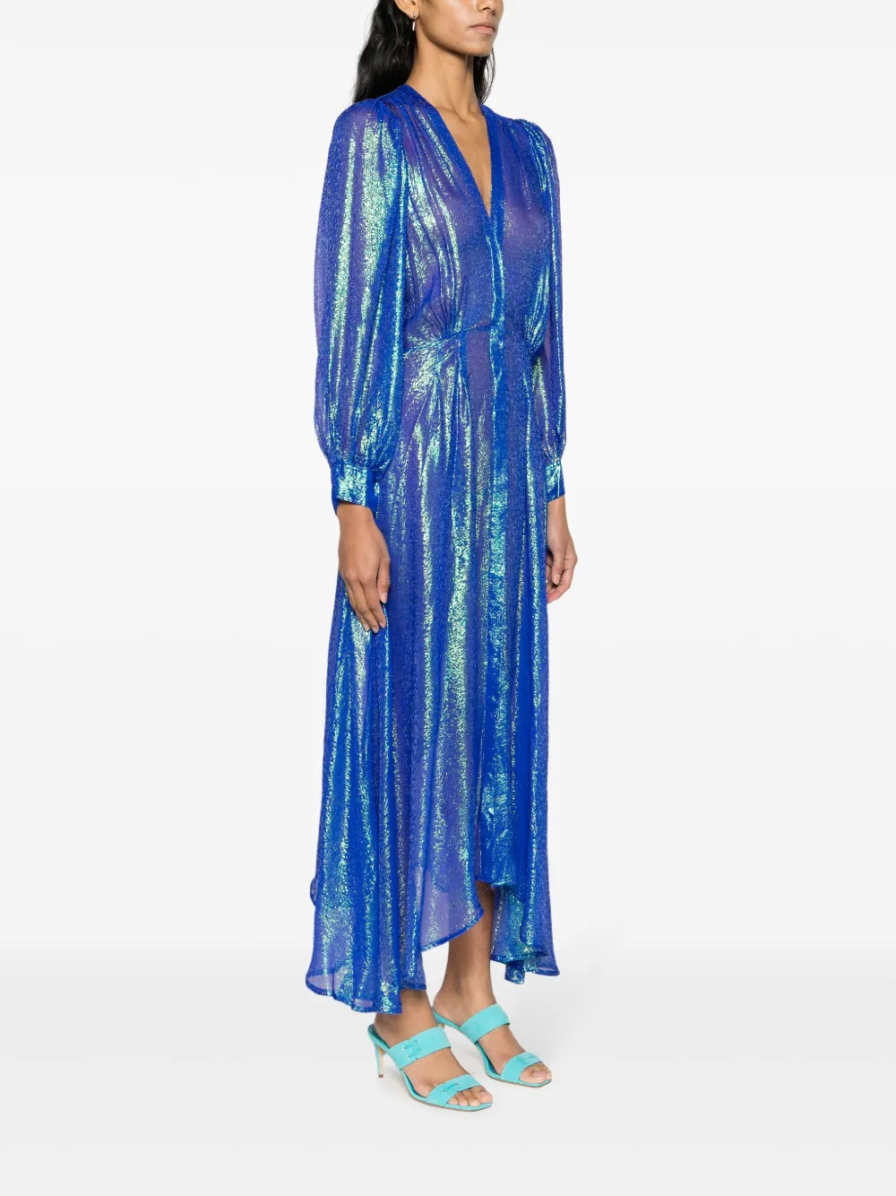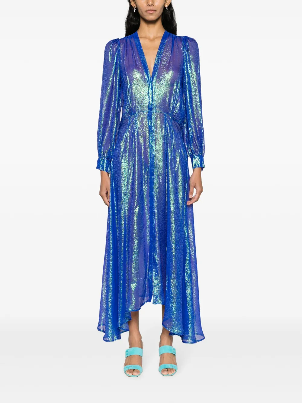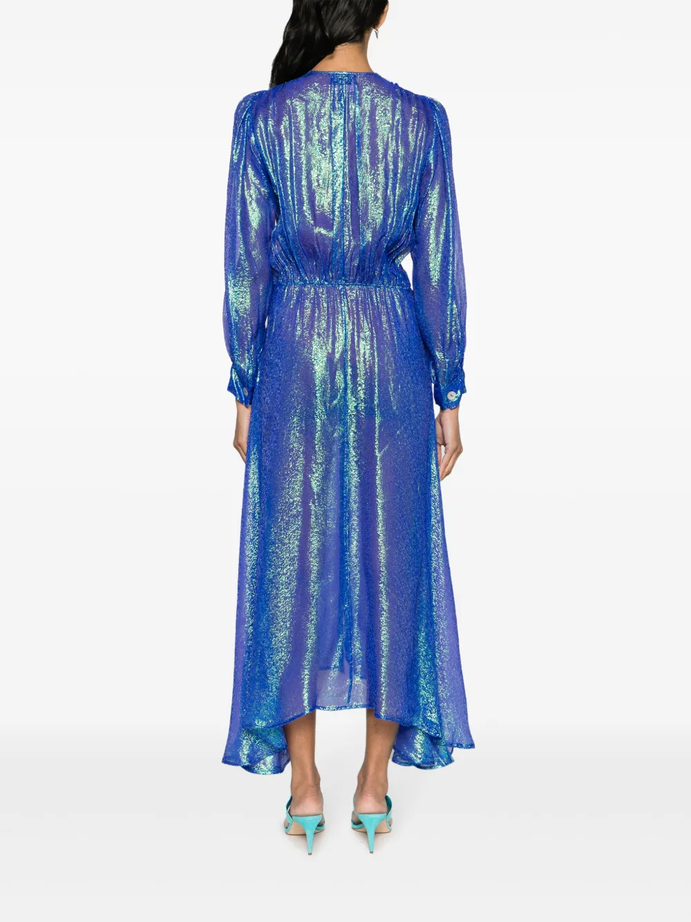 Синий, бирюзовый, смесовый шелк, без эффекта утяжеления, прозрачное покрытие, жаккардовый материал с узором, люрекс, складки, V-образный вырез, потайная пуговичная застежка спереди, длинные рукава, манжеты на пуговицах, эластичный пояс сзади и неравномерный подол.