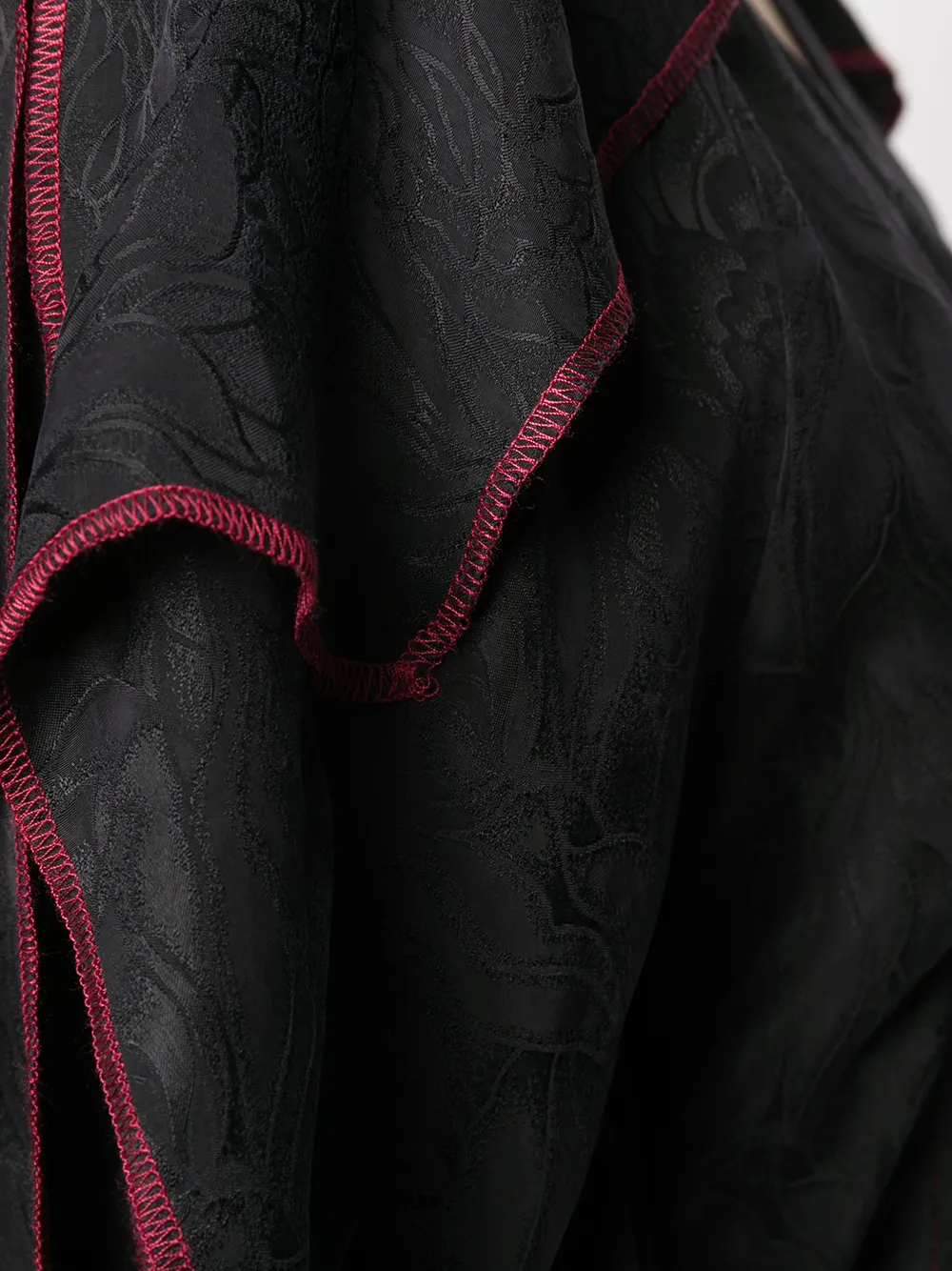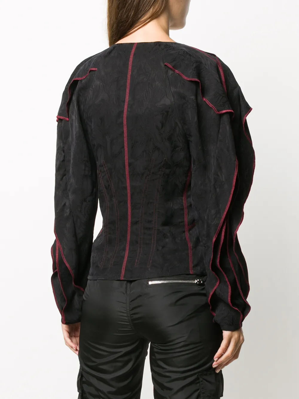 Приталенный силуэт, контрастная строчка, вставки с оборками, жаккардовый материал с узором, V-образный вырез, длинные рукава, застежка на заклепках и прямой подол. Цвет: черный.