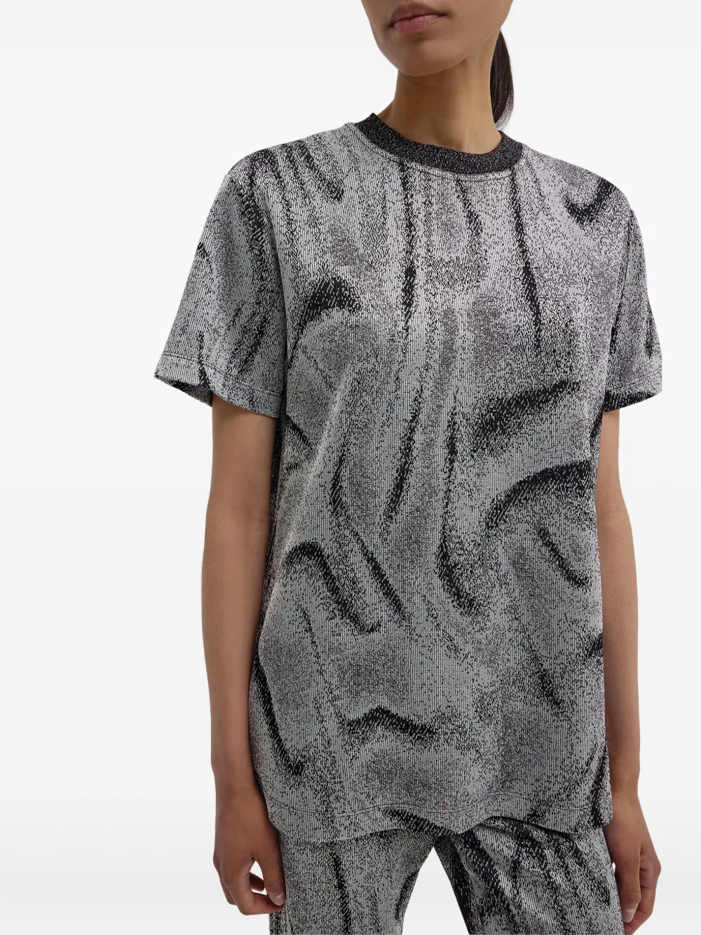 Серебристо-серый жаккардовый переплетение с короткими рукавами и круглым вырезом, абстрактный узор с металлическим эффектом.