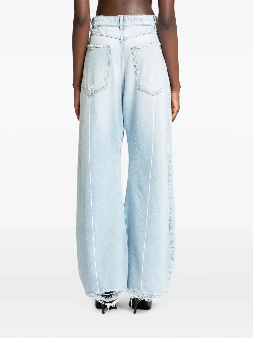 Светло-голубые необработанные края, деталь центрального шва, пять карманов.