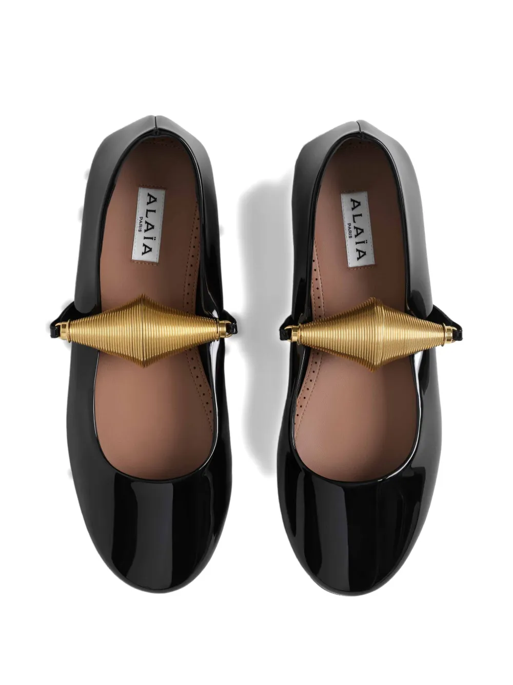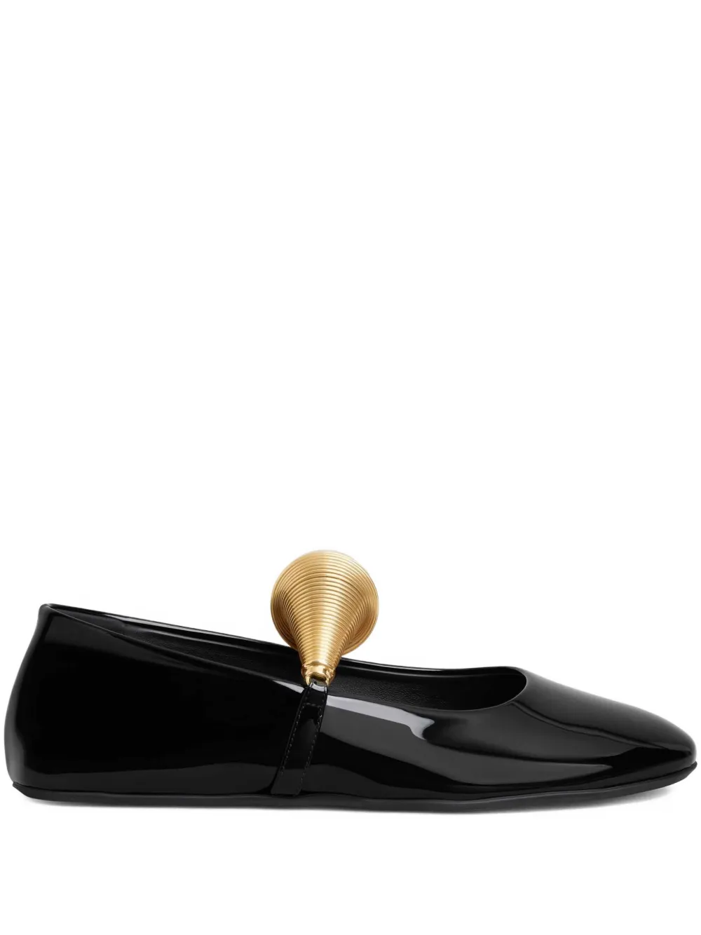 Черная кожа, лакированная отделка, золотистая отделка, круглый носок, плоская подошва
