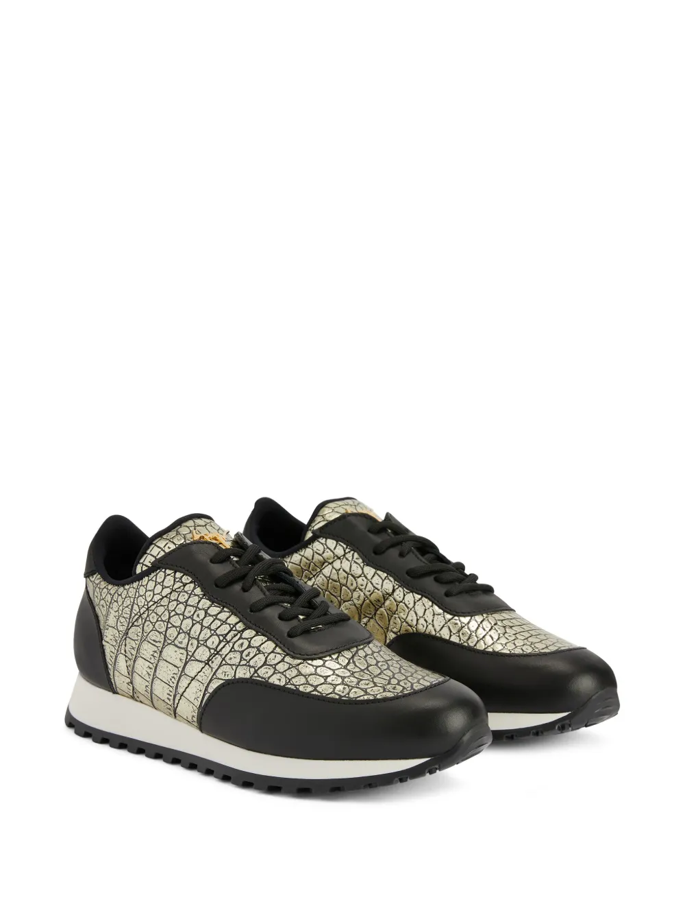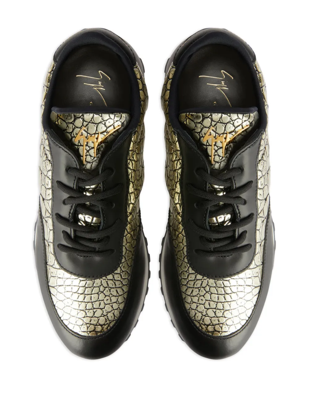 Черный, бежевый, кожа, тиснение под кожу крокодила, вставки, золотистый металлический логотип, металлический логотип на язычке, закругленный носок, шнуровка спереди, задник с логотипом, стелька с логотипом и рифленая резиновая подошва.