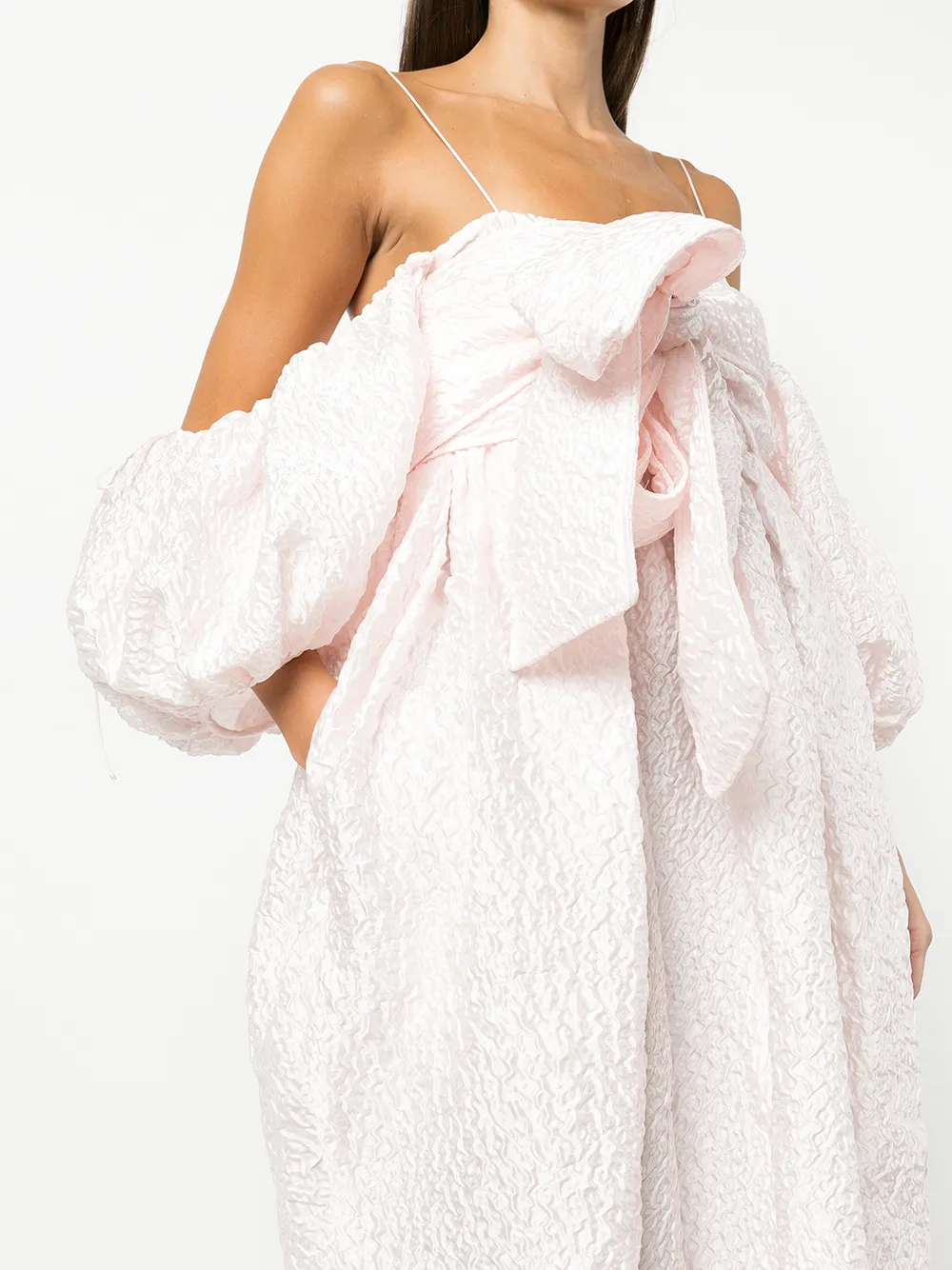Розовый, фактурная отделка, завязки спереди, два вшитых кармана по бокам, открытые плечи, короткие объемные рукава, длинная модель и прямой подол.
