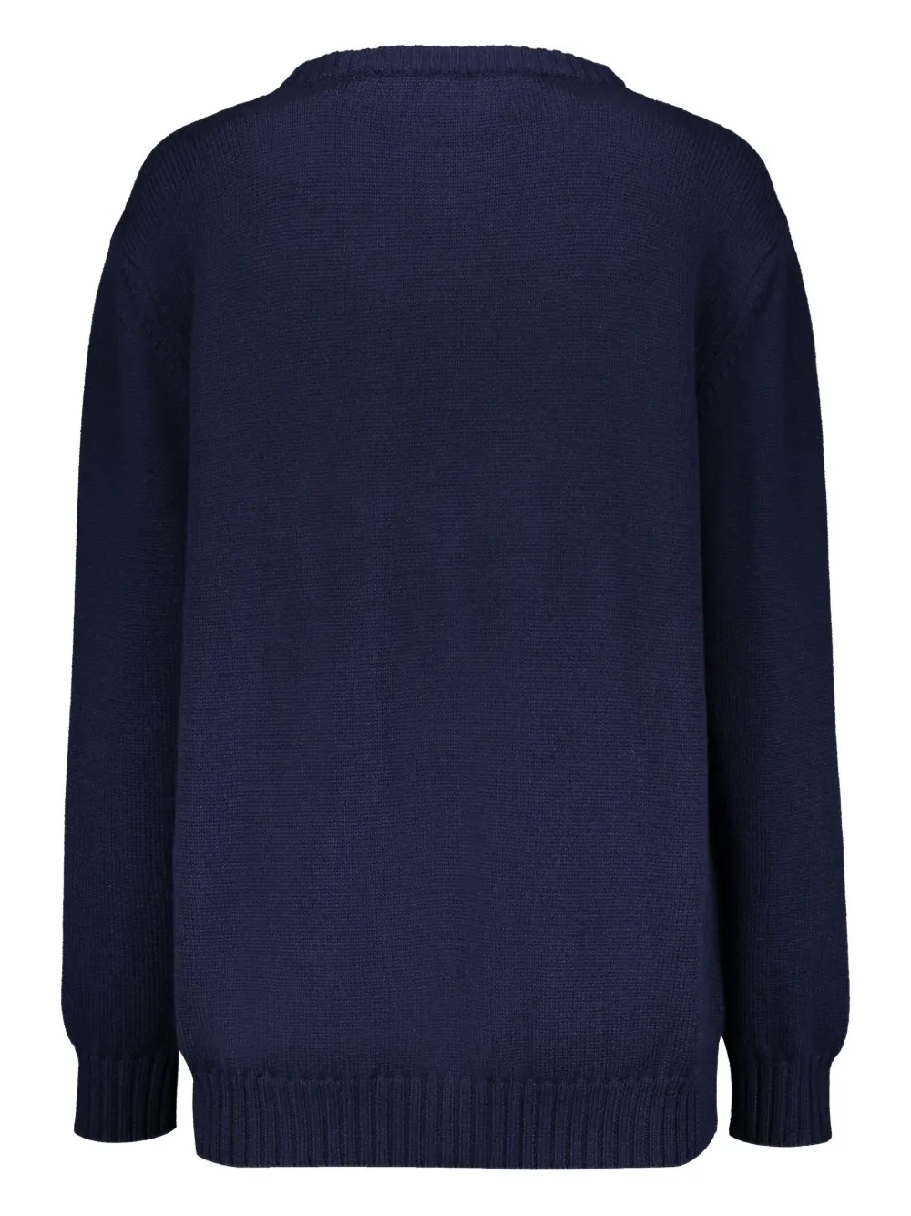 Темно-синий джемпер 'Alitalia' из натуральной шерсти вязки интарсия от Alberta Ferretti. Круглый вырез под горло в рубчик, длинные рукава, подол и манжеты в рубчик.