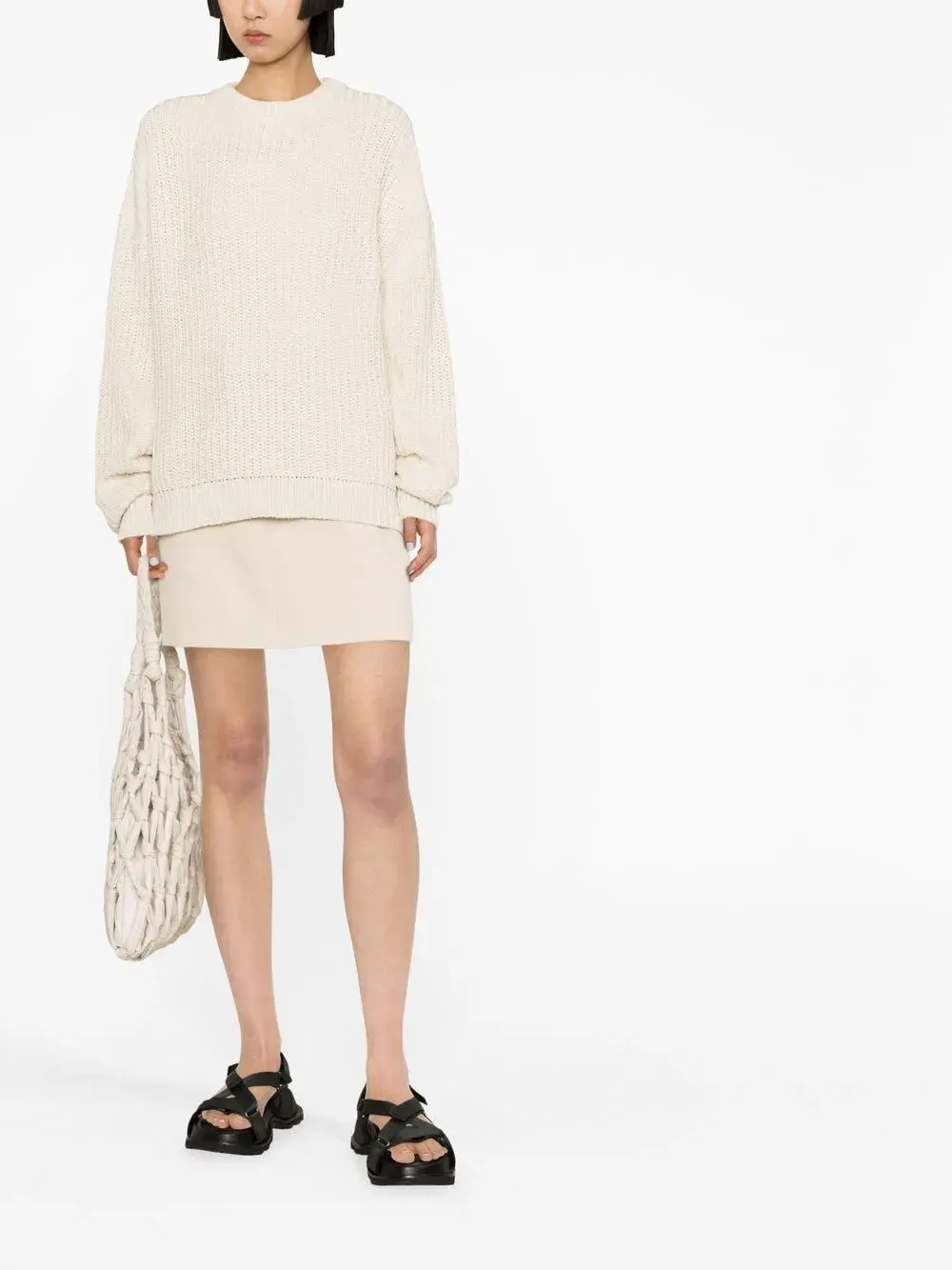 Цвет слоновой кости, шелк, вязка в технике интарсия, круглый вырез, длинные рукава и вязаные края в рубчик.