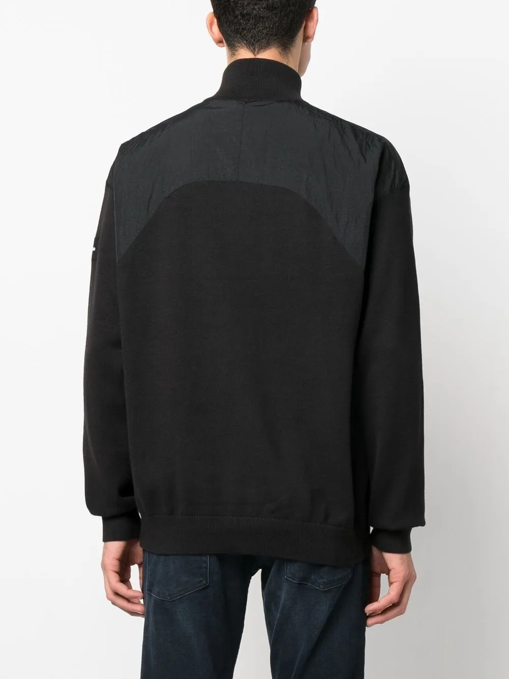 Черный, смесовый хлопок, вставки, нашивка с логотипом на рукаве, высокий воротник, застежка на молнии спереди, длинные рукава, эластичные манжеты и эластичный подол.