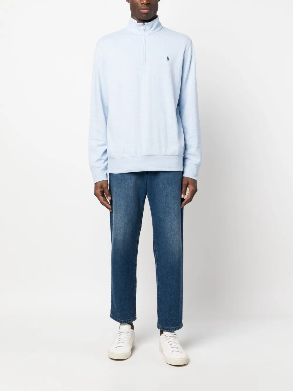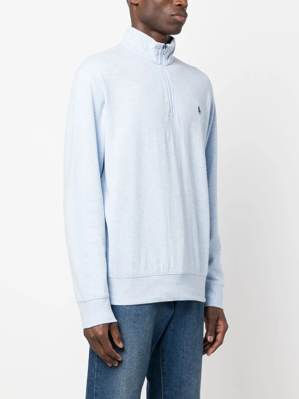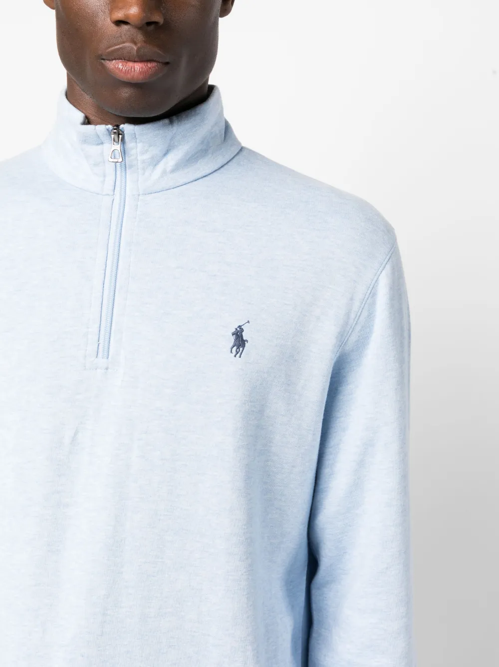 Голубой, смесовый хлопок, флисовый материал, вышитый логотип, воротник-стойка, длинные рукава, короткая застежка на молнии спереди и прямой подол.