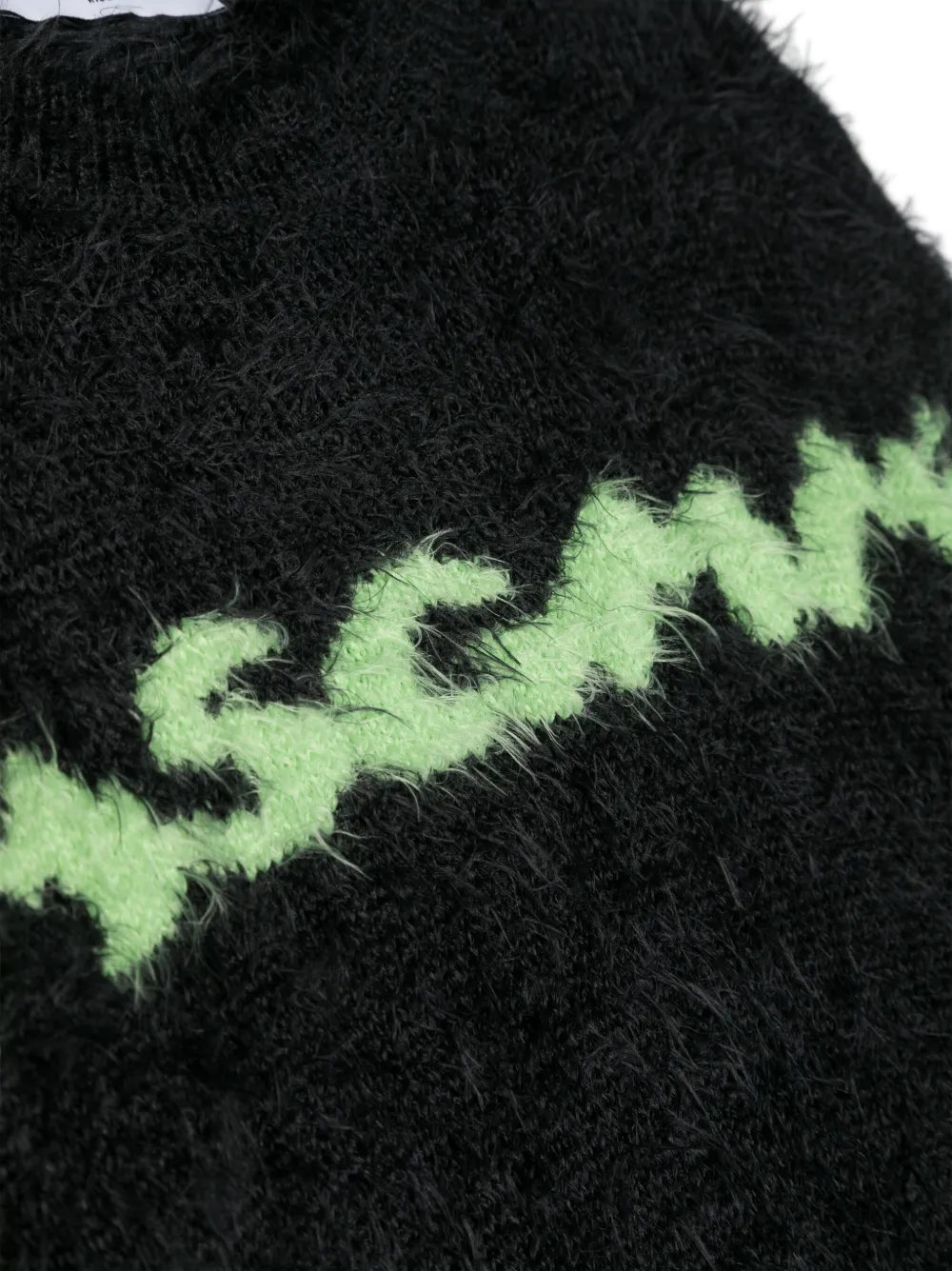 Черный, светло-зеленый, матовый эффект, трикотажный материал, логотип в технике интарсия, круглый вырез, длинные рукава и прямой подол.