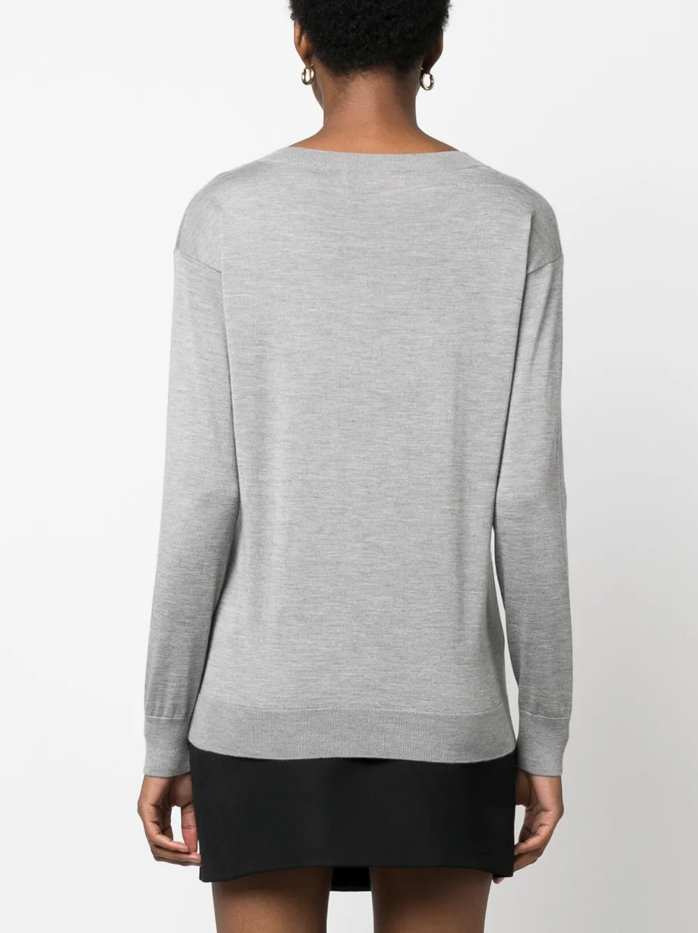 Светло-серый, смесь кашемира и шелка, трикотажный материал, отделка VGOLD, V-образный вырез и длинные рукава.