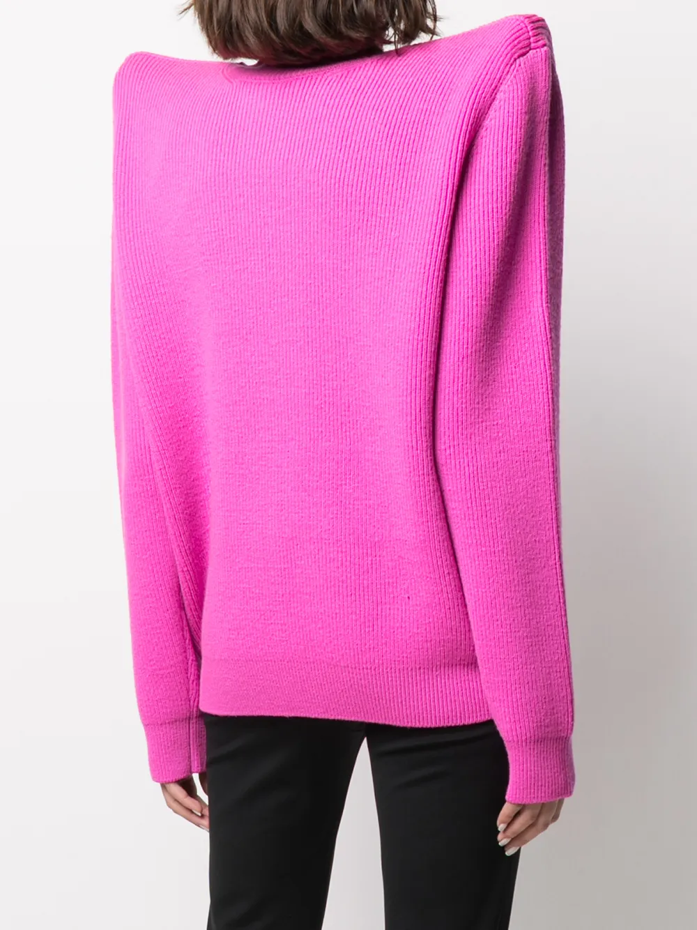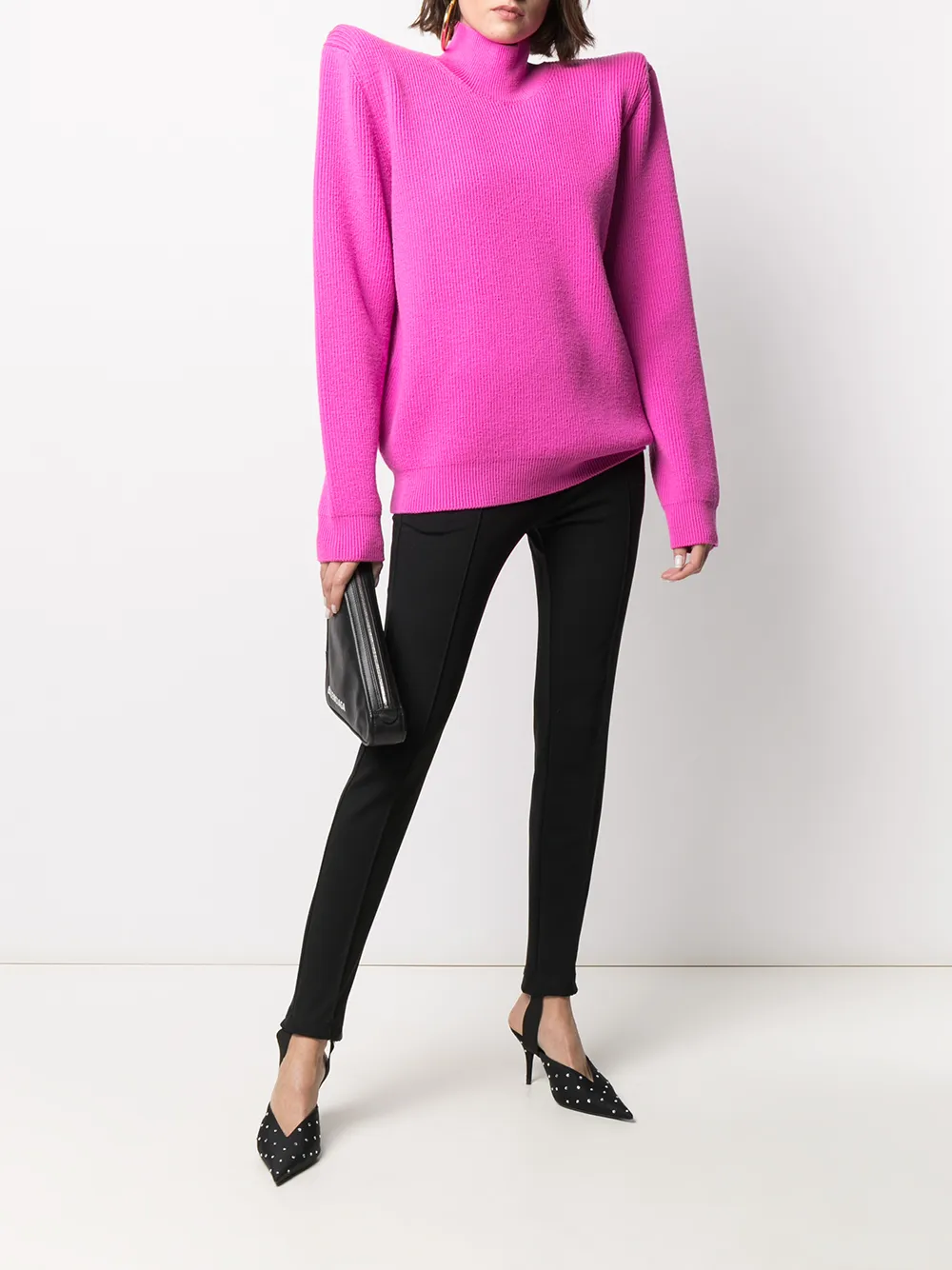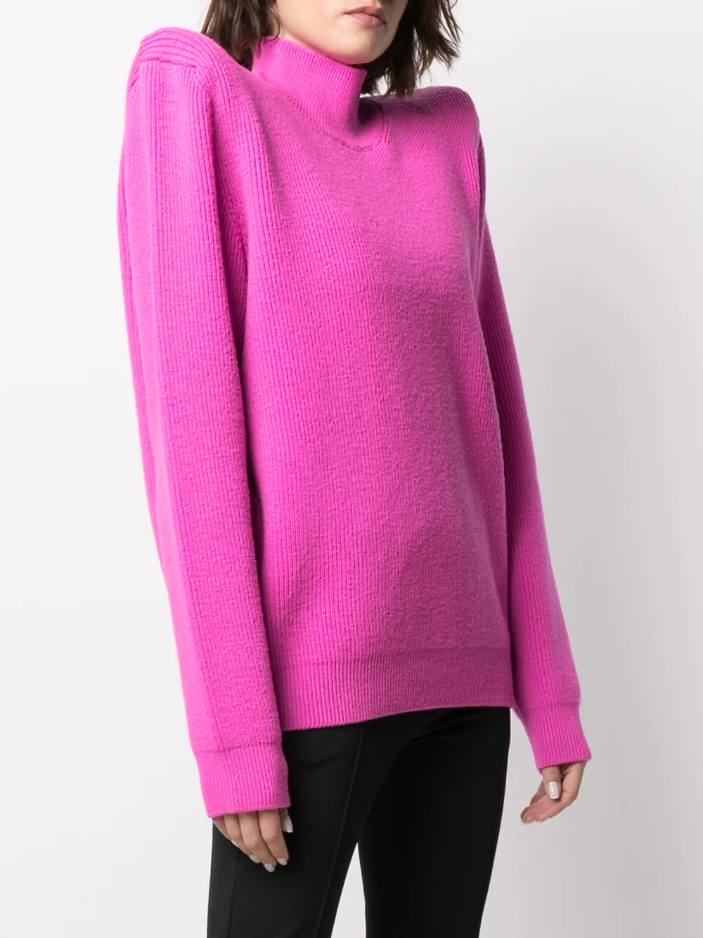 Каждый из нас заслуживает внимания. Обратить на себя взгляды поможет джемпер оттенка фуксии с высоким воротником и объемными плечами из коллекции Balenciaga. Джемпер выполнен из смесовой шерсти, имеет длинные рукава, ребристую фактуру и прямой подол.