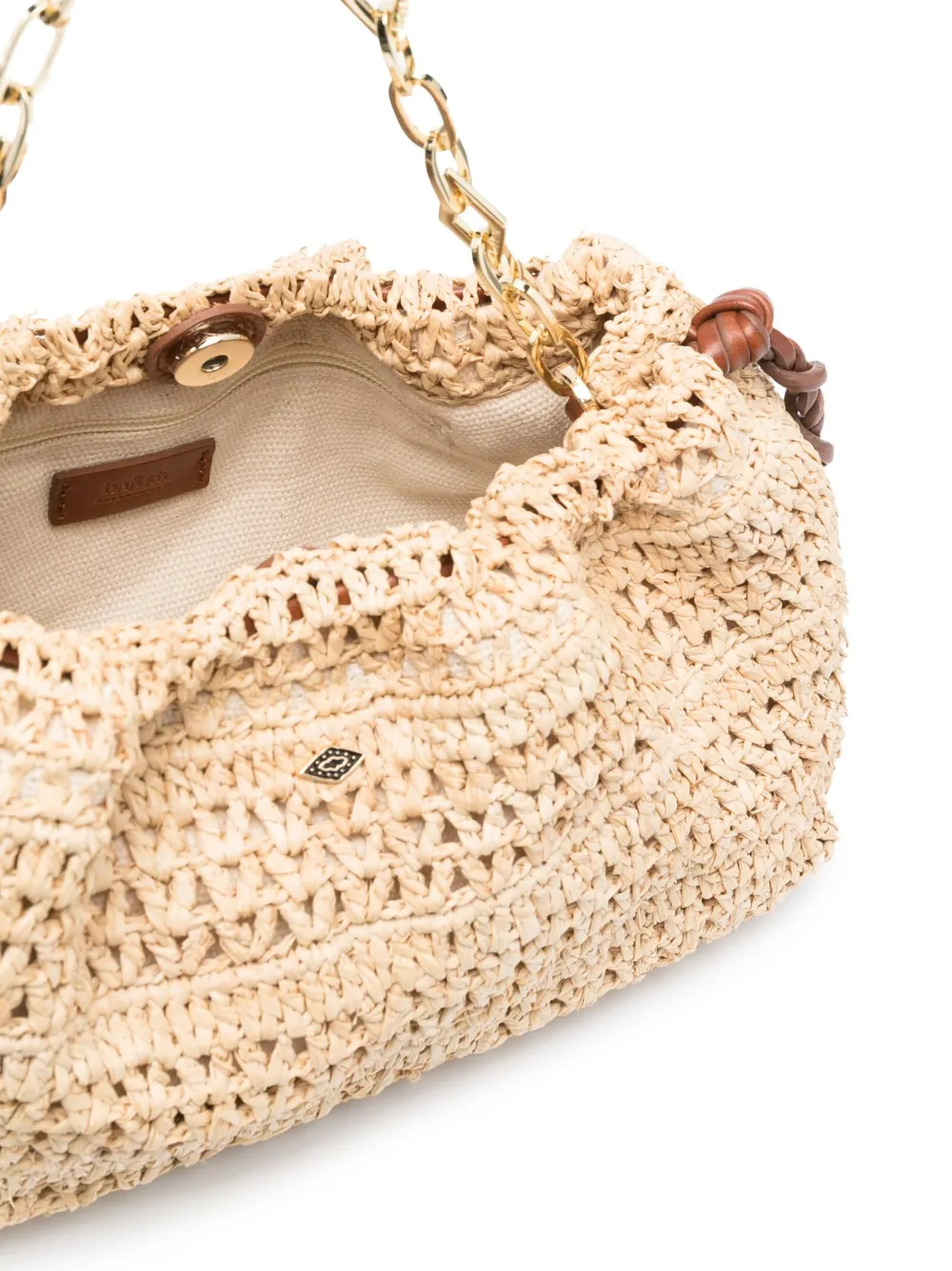 Бежевый, рафия, телячья кожа, ремешок-цепочка на плечо, кулиска и основное отделение.