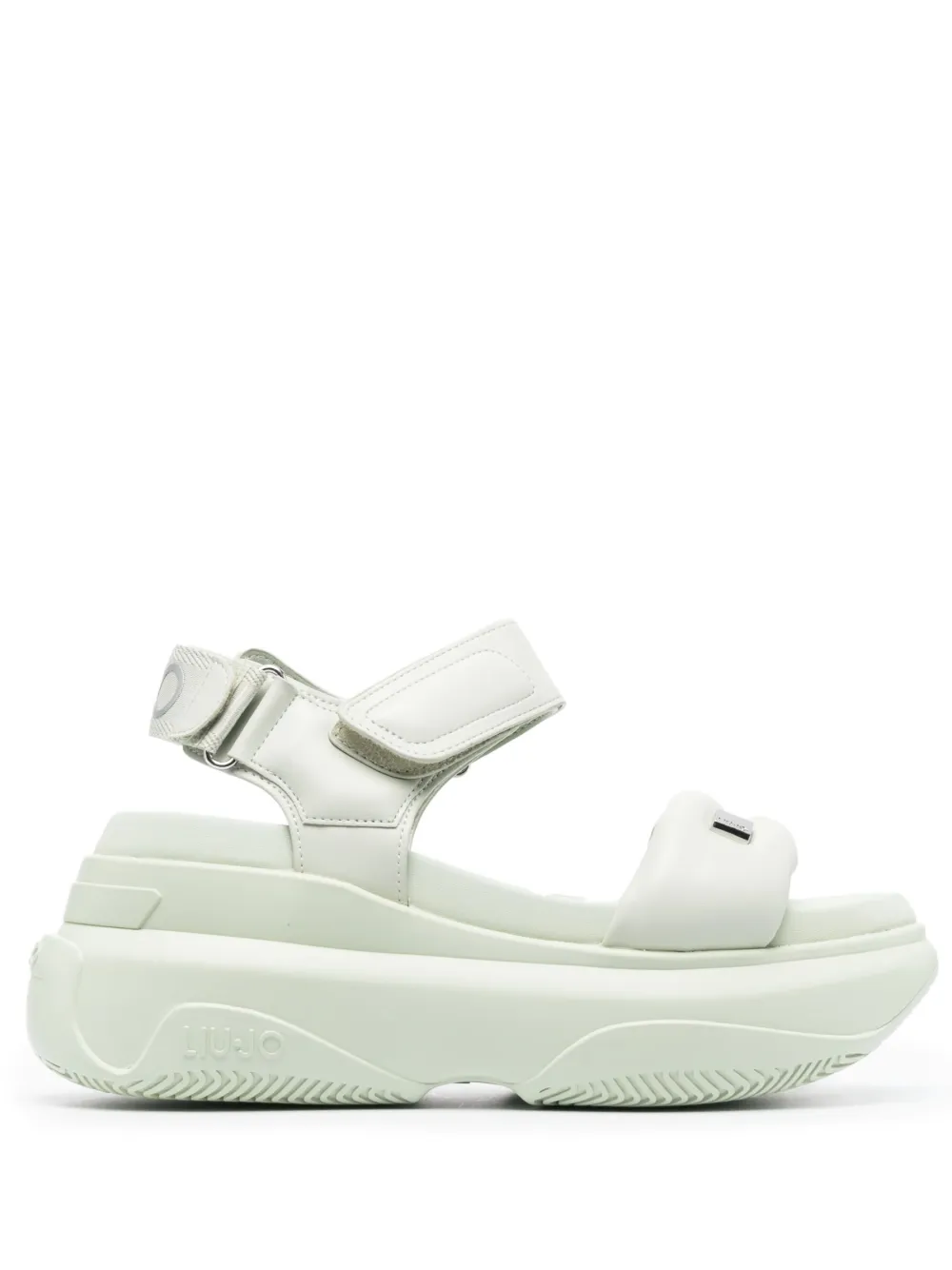 Мятно-зеленый, серебристый металлический логотип, принт с логотипом сзади, открытый носок, застежка на липучке спереди, логотип на стельке, резиновая подошва и подошва на платформе.