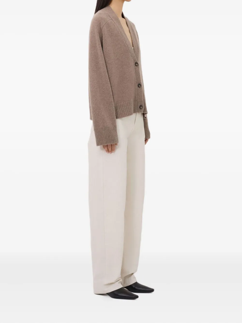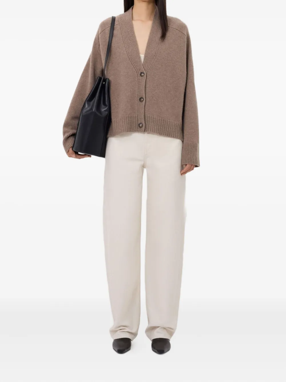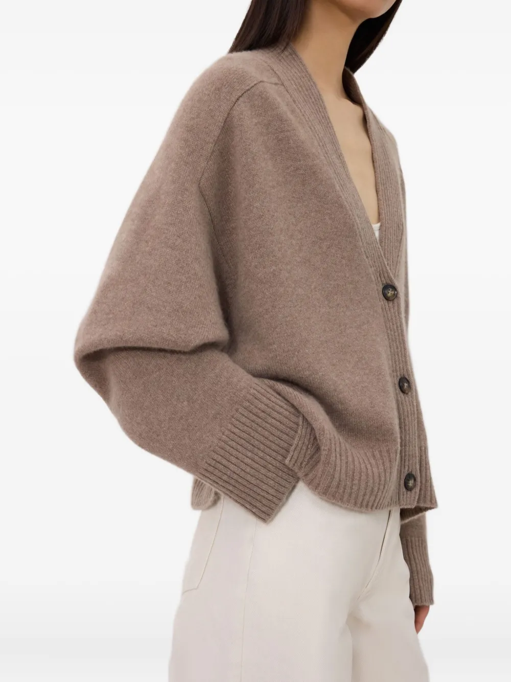 Коричневый V-образный вырез, застежка на пуговицы, ребристые манжеты, ребристый подол.