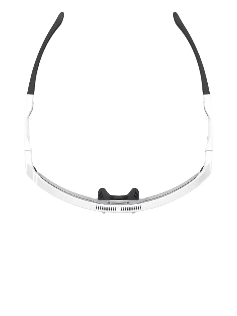 Белая защитная оправа, тонированные линзы, носоупоры. Очки поставляются с защитным футляром.