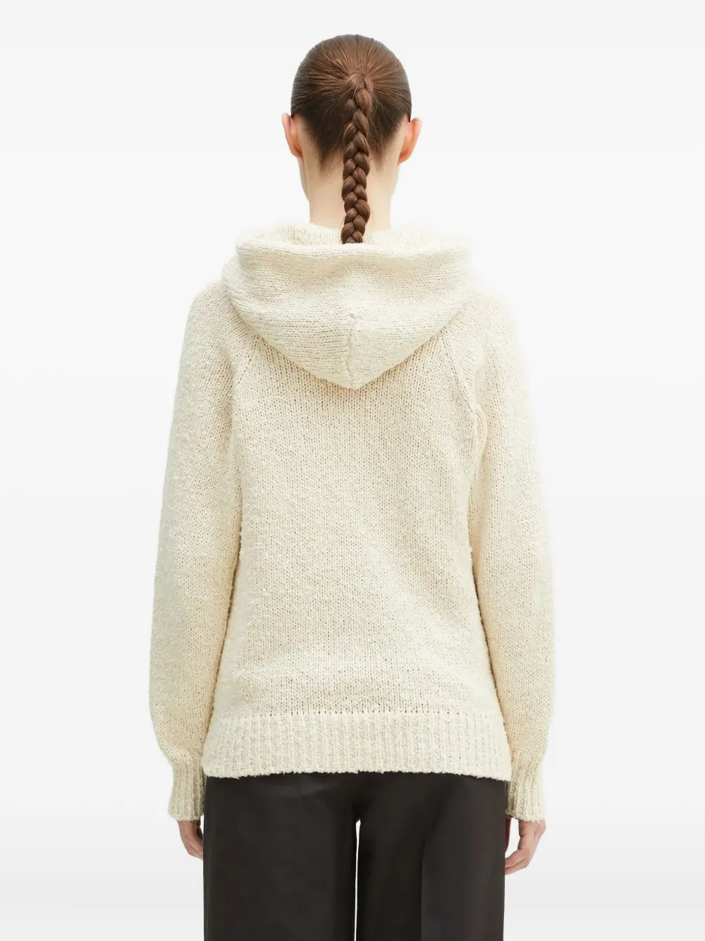 Белый капюшон, длинные рукава, ребристые манжеты, трикотажная конструкция.