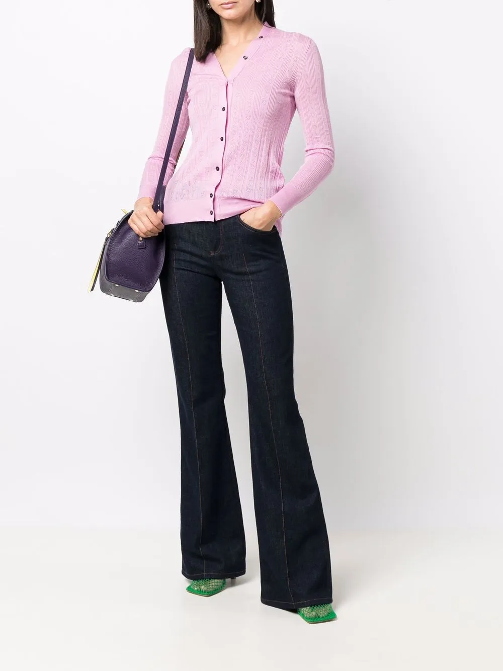 Кружевное вязание, принт Gancini, V-образный вырез, застежка на пуговицах спереди, длинные рукава и прямой подол.