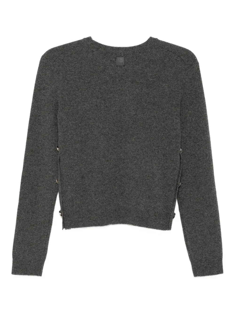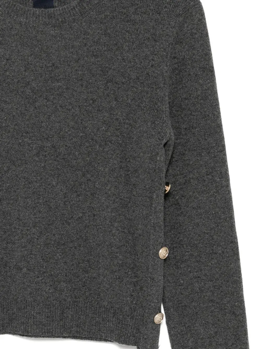 Серый, с застежкой на две пуговицы по бокам, длинными рукавами, ребристыми манжетами и подолом.