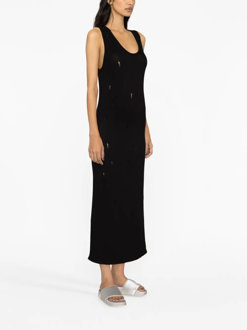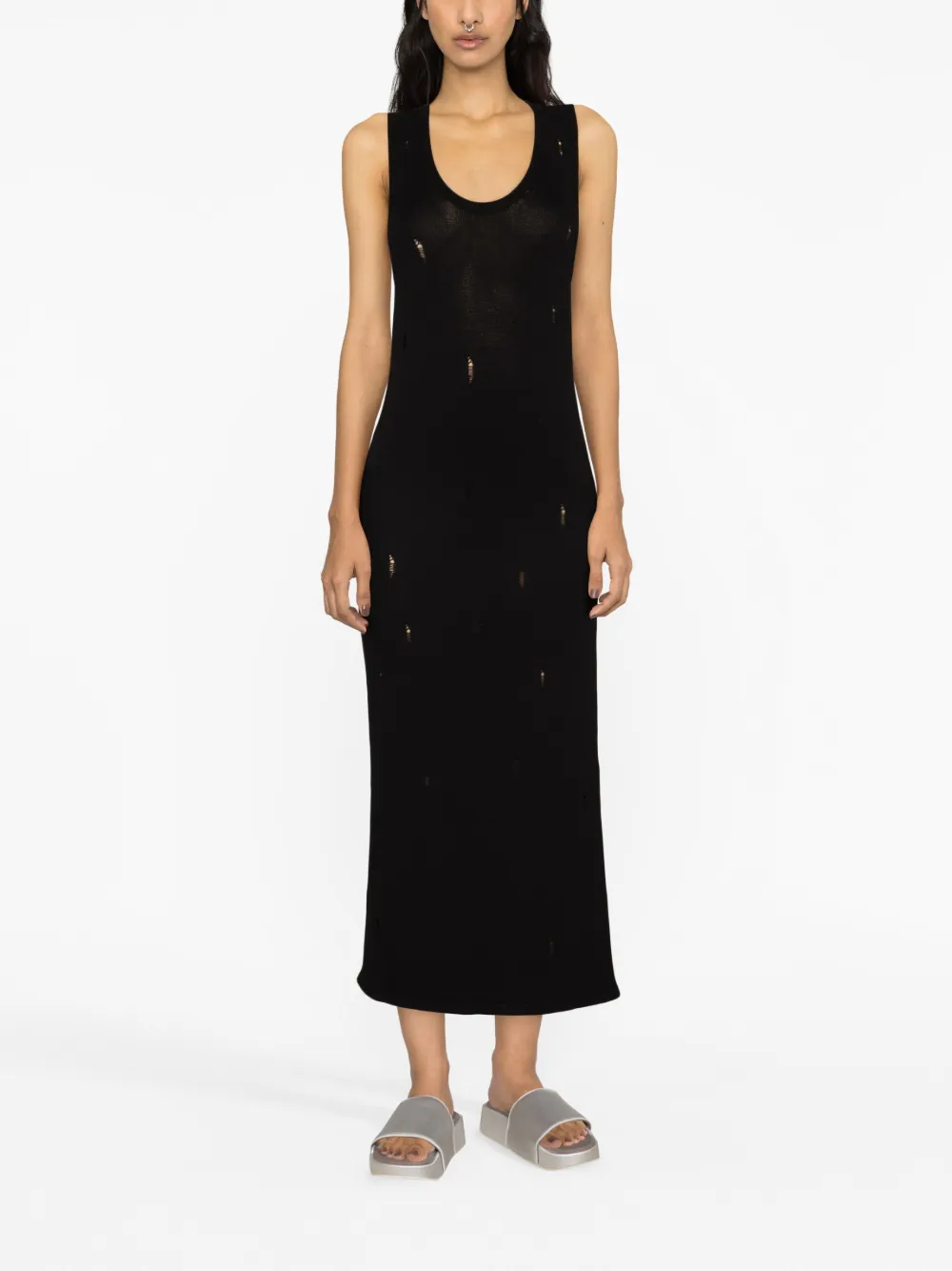 Черный, трикотажный материал, искусственно состаренное покрытие, U-образный вырез, без рукавов, прямой подол и длина миди.