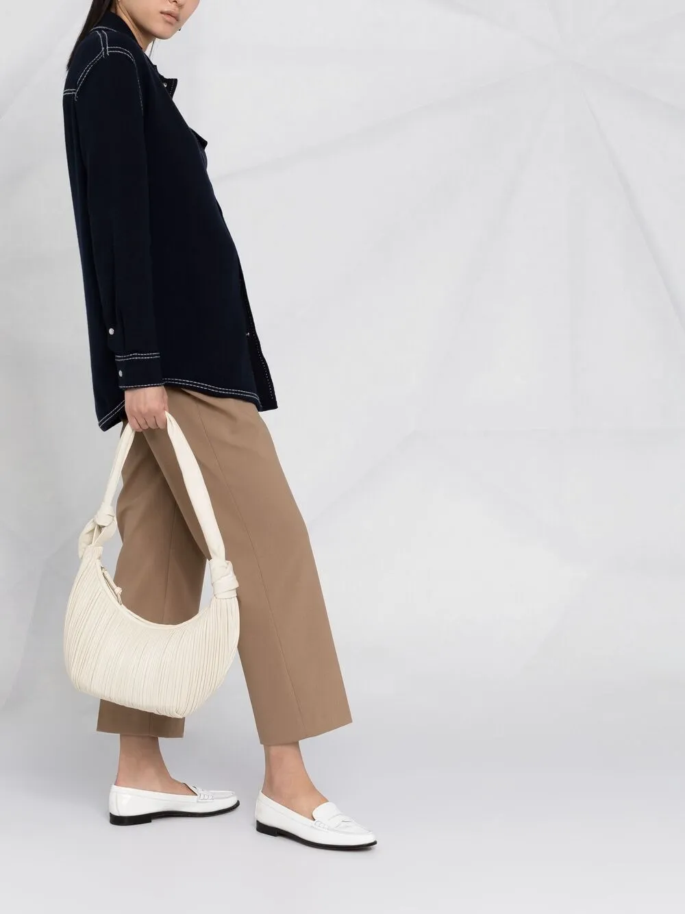 Классический воротник, застежка на заклепках, нагрудный накладной карман, контрастная строчка и рукава с манжетами на пуговицах. Цвет: черный.