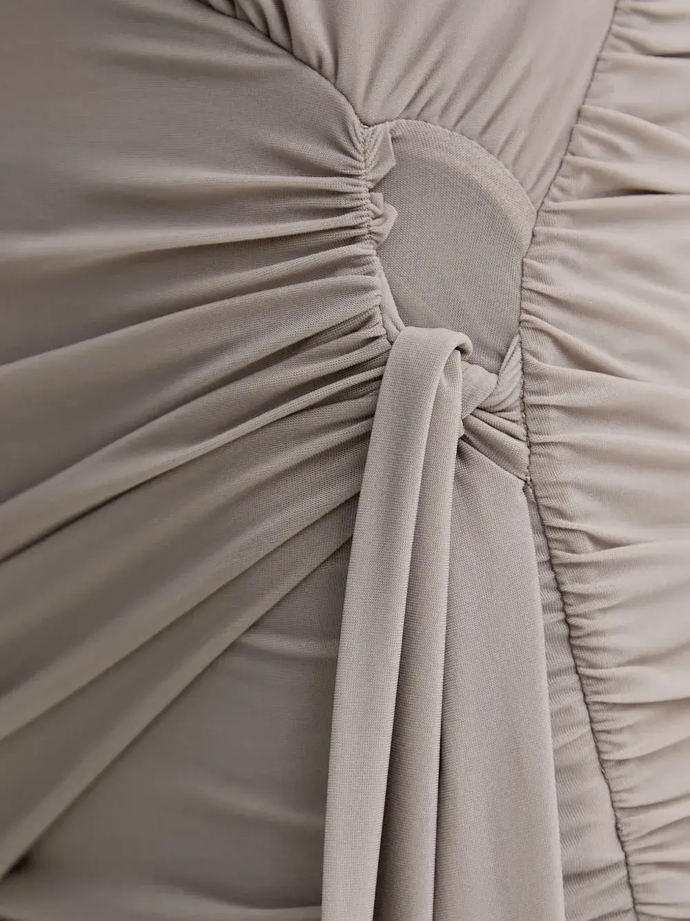 Серая драпированная ткань, завязанный узел на горловине, асимметричный подол, боковые вырезы, присборенная талия