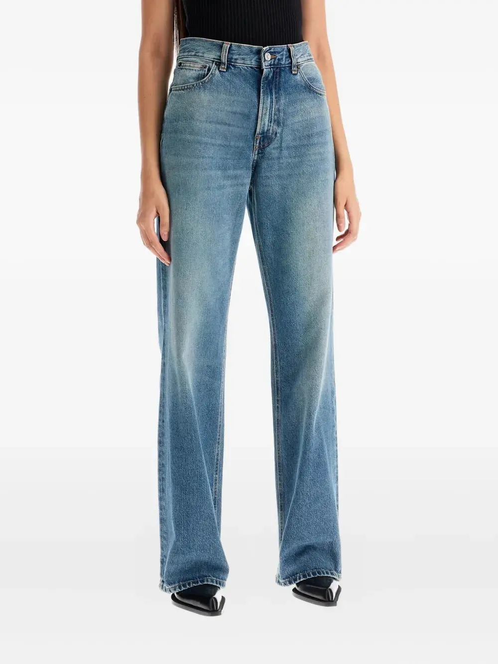 Светло-голубые широкие брюки с высокой талией, застежкой на пуговицы, классическим фасоном, пятью карманами, прямым подолом
