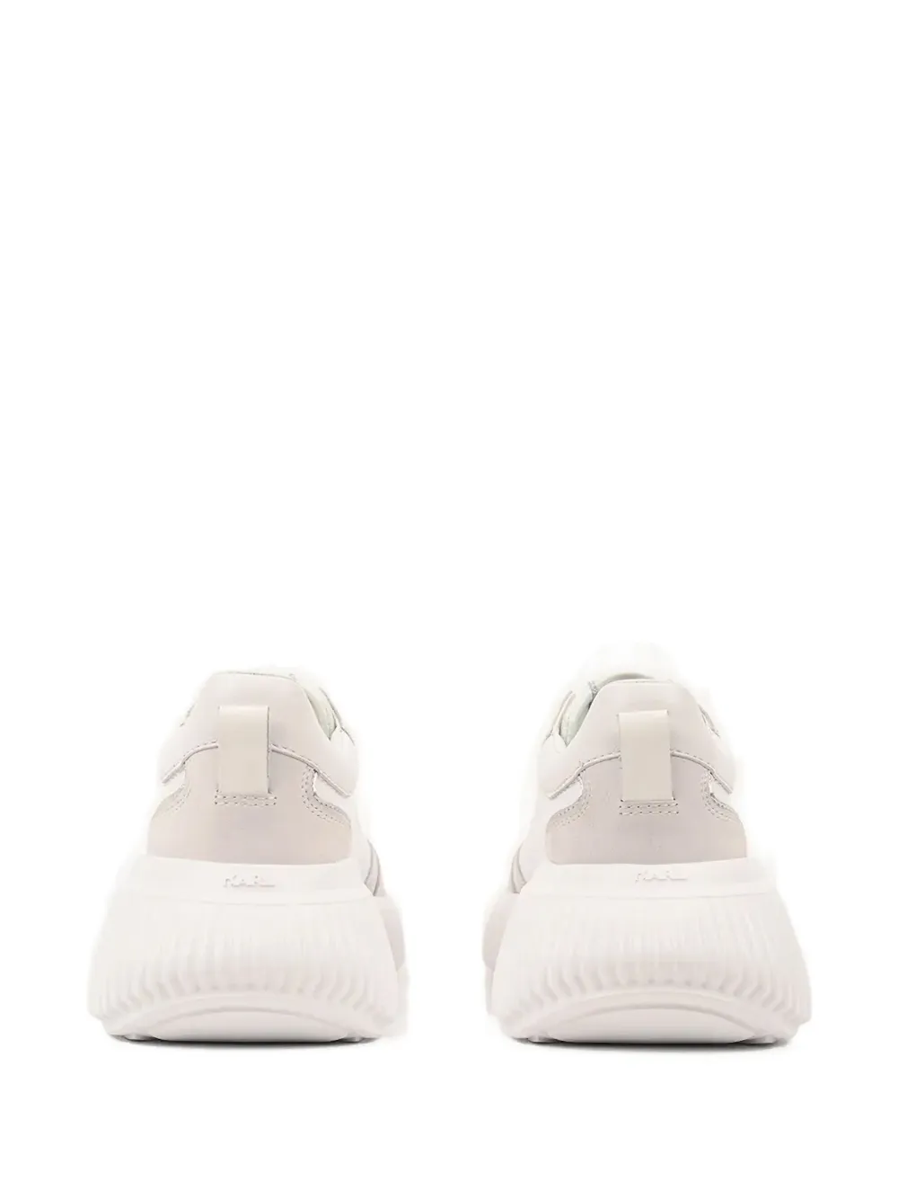 Верх из белой кожи, платформа, шнуровка, серебристая вставка на пятке, ребристая подошва.