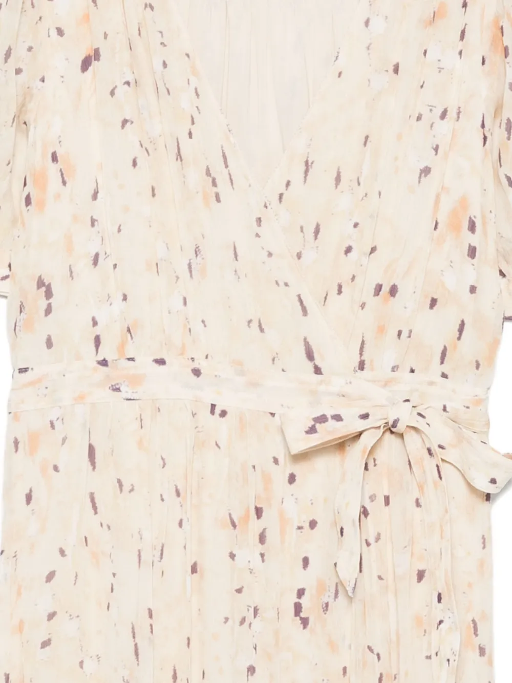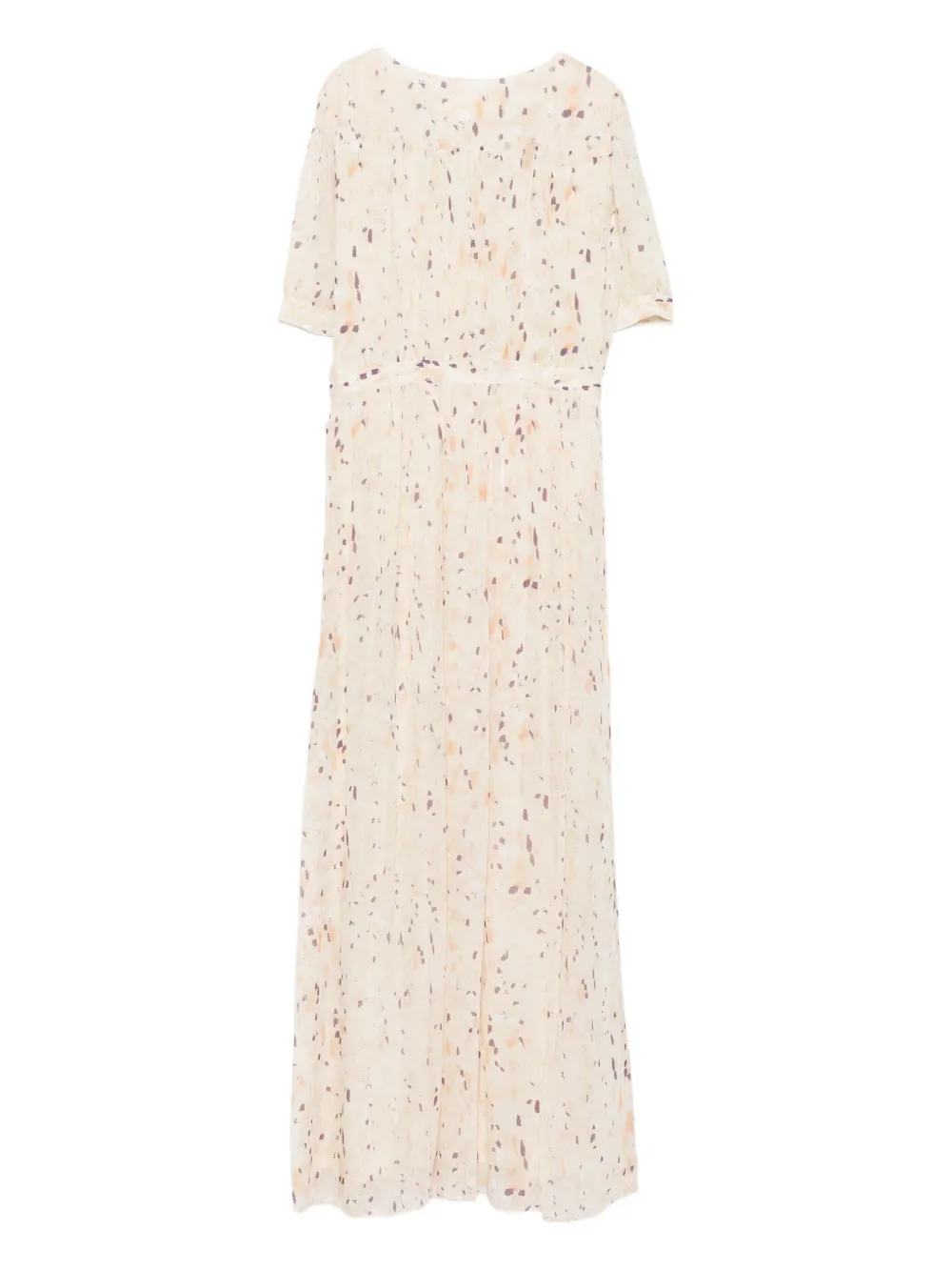 Юбка бежевого цвета с абстрактным принтом, V-образным вырезом, короткими рукавами, завязывающимся поясом, плиссировкой.