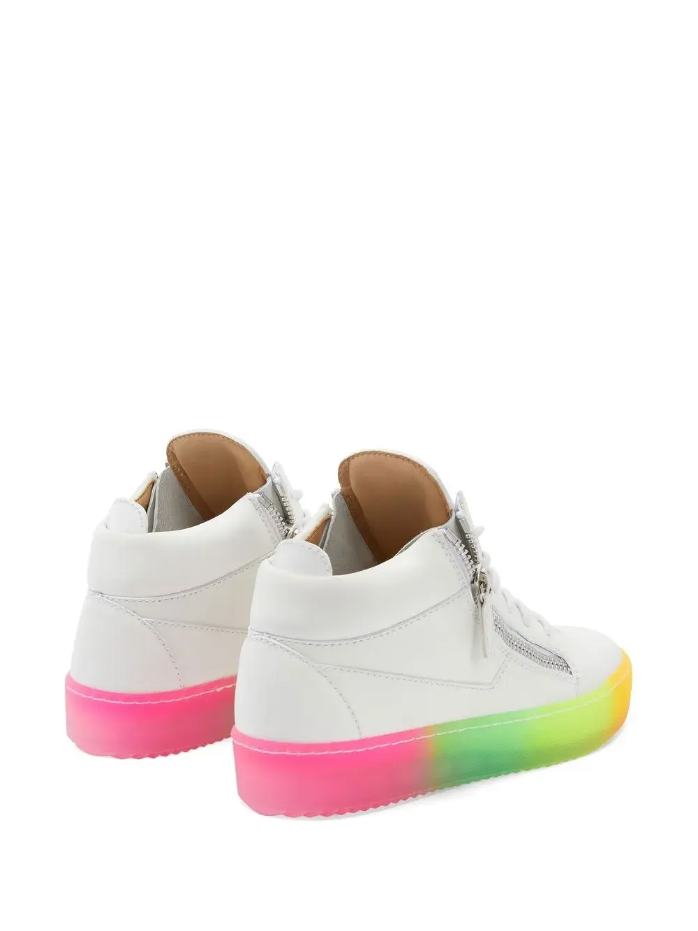 Белый/разноцветный, кожа, радужный принт, короткая застежка на молнии сбоку, шнуровка спереди и плоская резиновая подошва.
