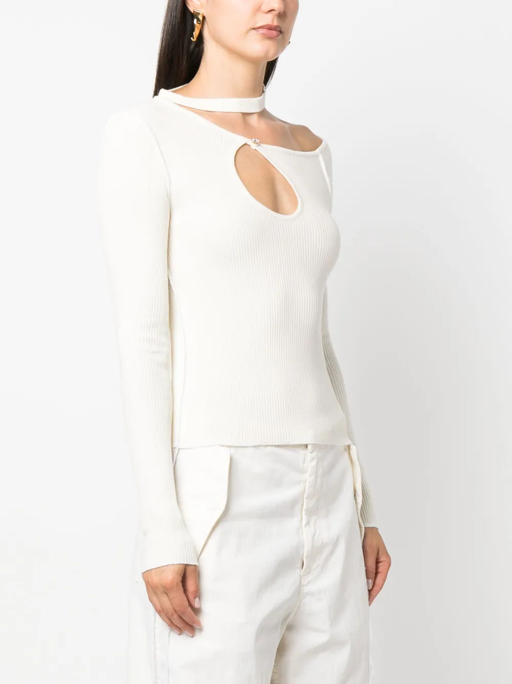 Кремово-белый, трикотаж в рубчик, вырезные детали, декоративные пуговицы, асимметричный вырез, длинные рукава и прямой подол.