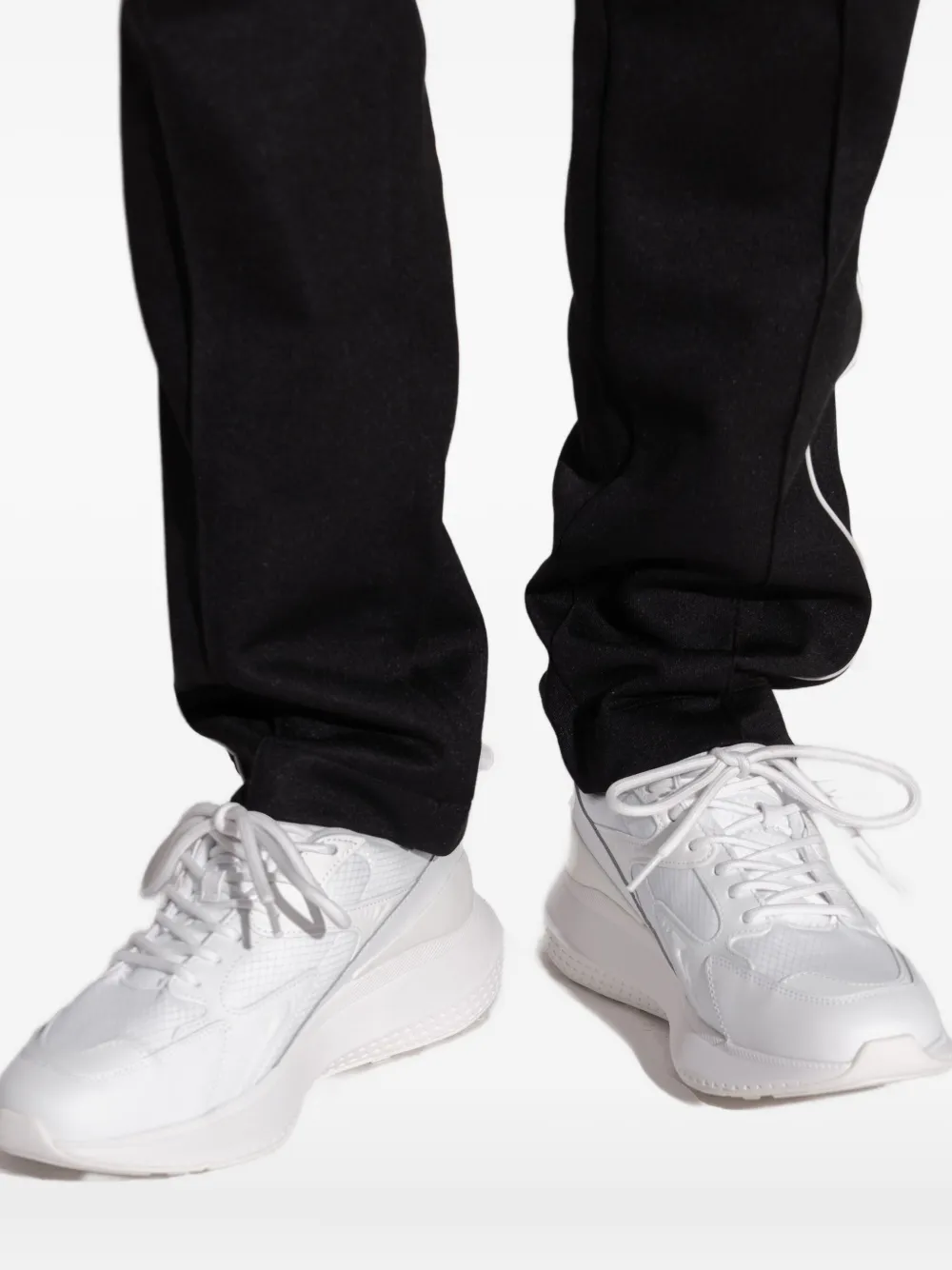 Белая шнуровка, рельефная подошва, мягкий воротник-стойка, изогнутый задник