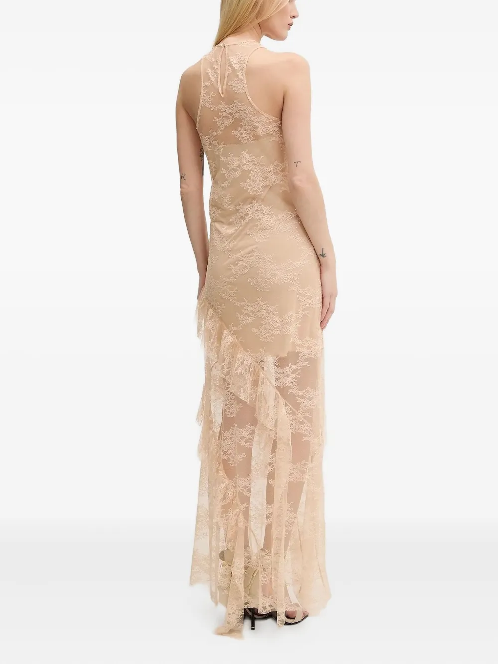 Бежевый кружевной материал с оборками, без рукавов, асимметричный подол.