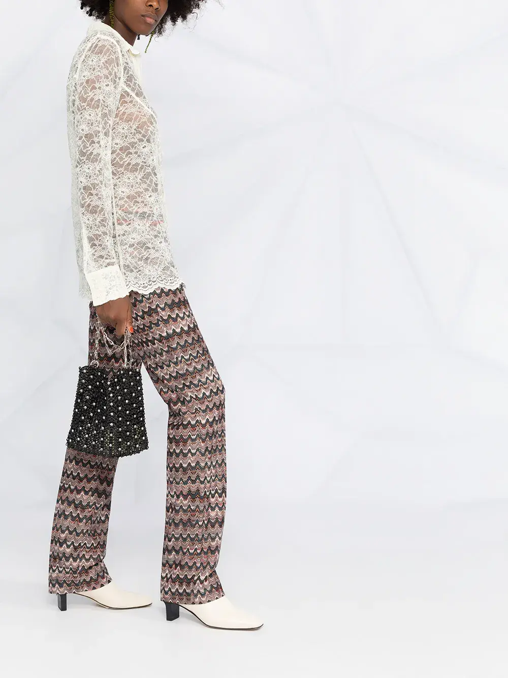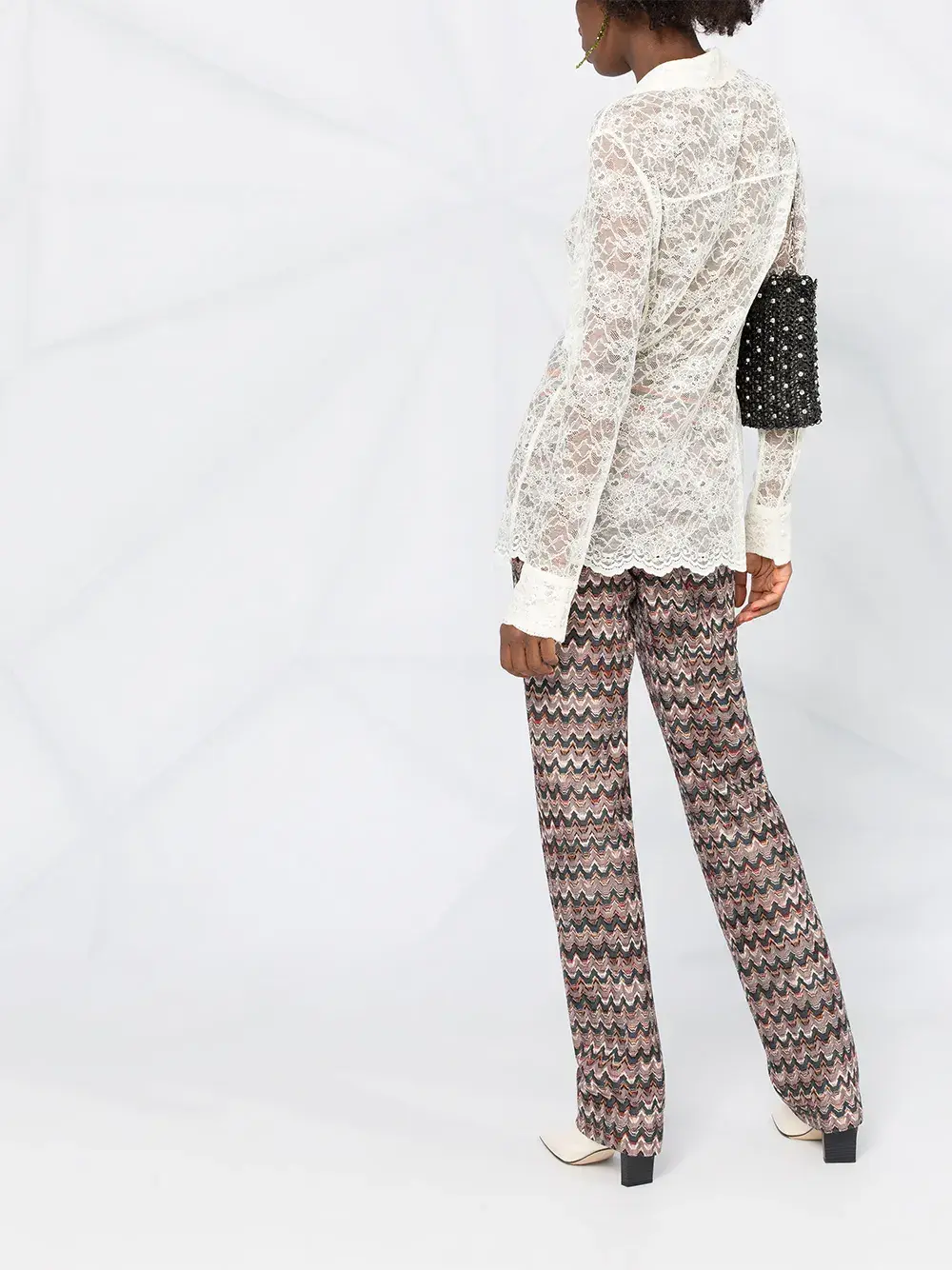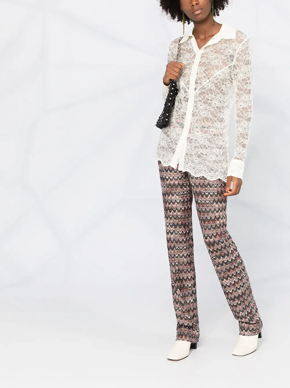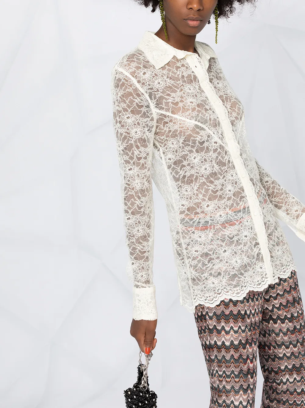 Прозрачные кружевные вставки, края с фестонами, прямой воротник, застежка на пуговицах спереди, длинные рукава и манжеты на пуговицах.