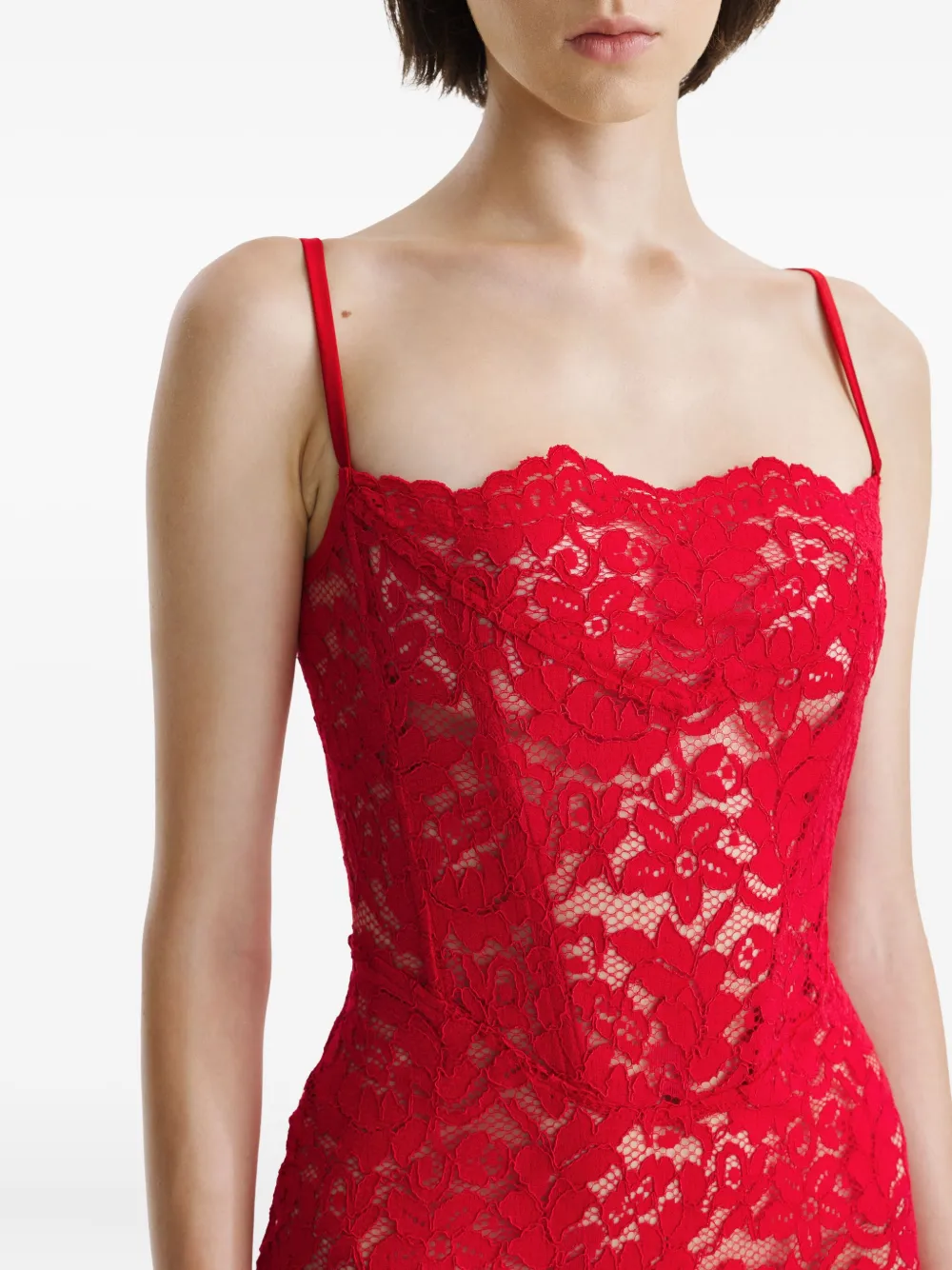 Красные кружевные вставки, без рукавов, застежка-молния сзади, облегающий покрой.