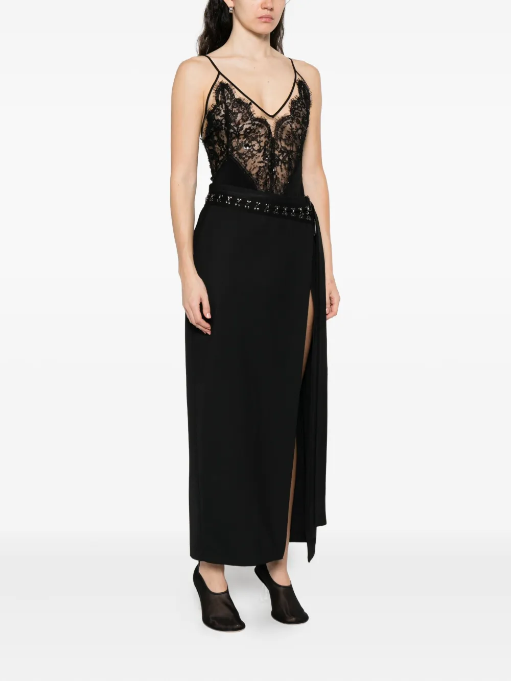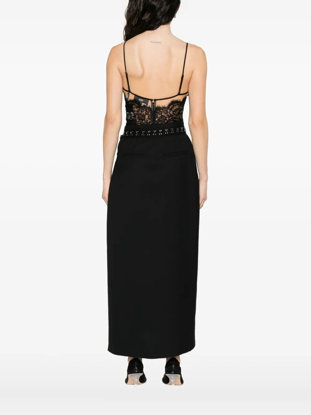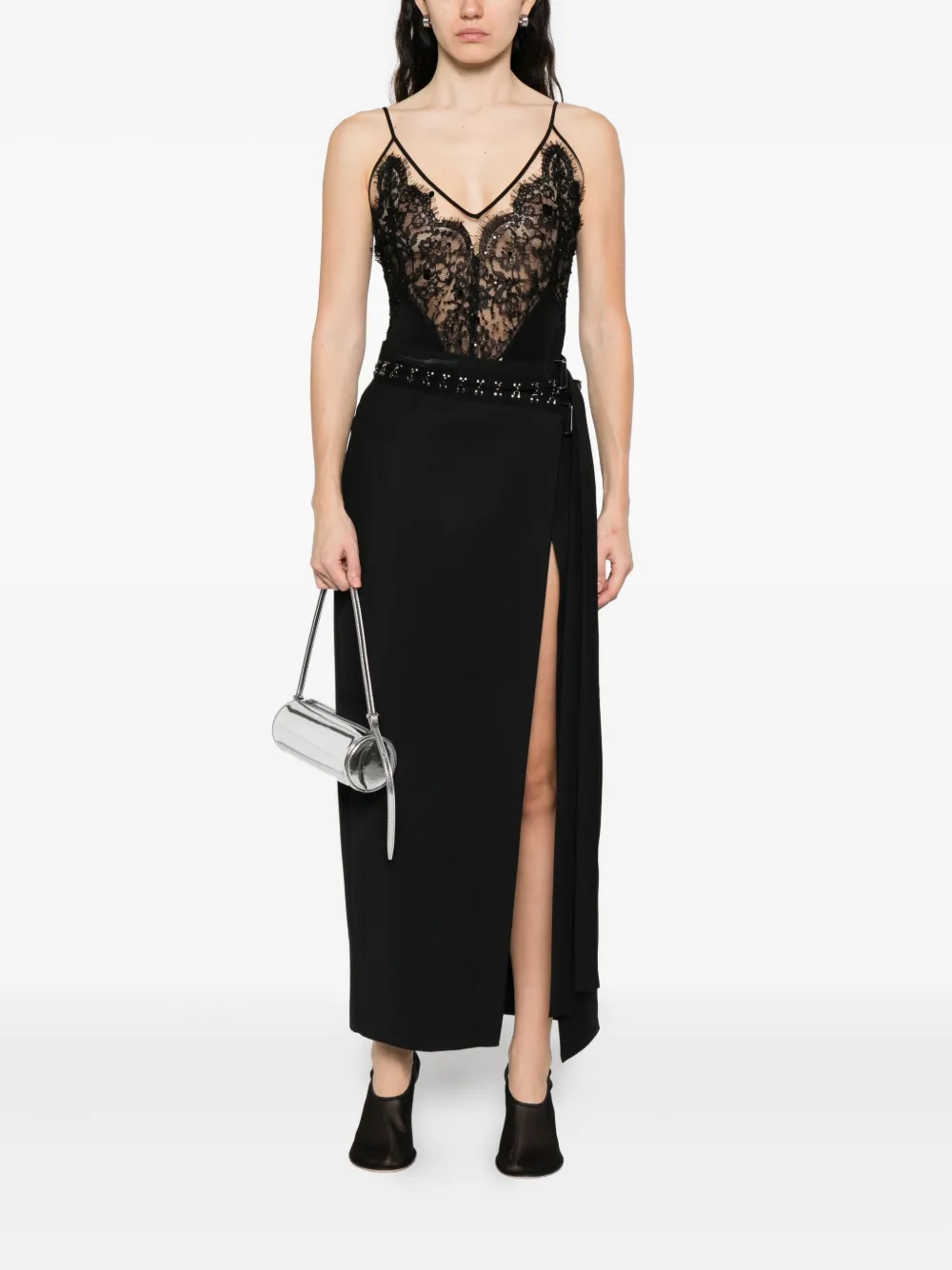 Черная кружевная панель, отделка пайетками, V-образный вырез, регулируемые тонкие бретельки, облегающее крое.