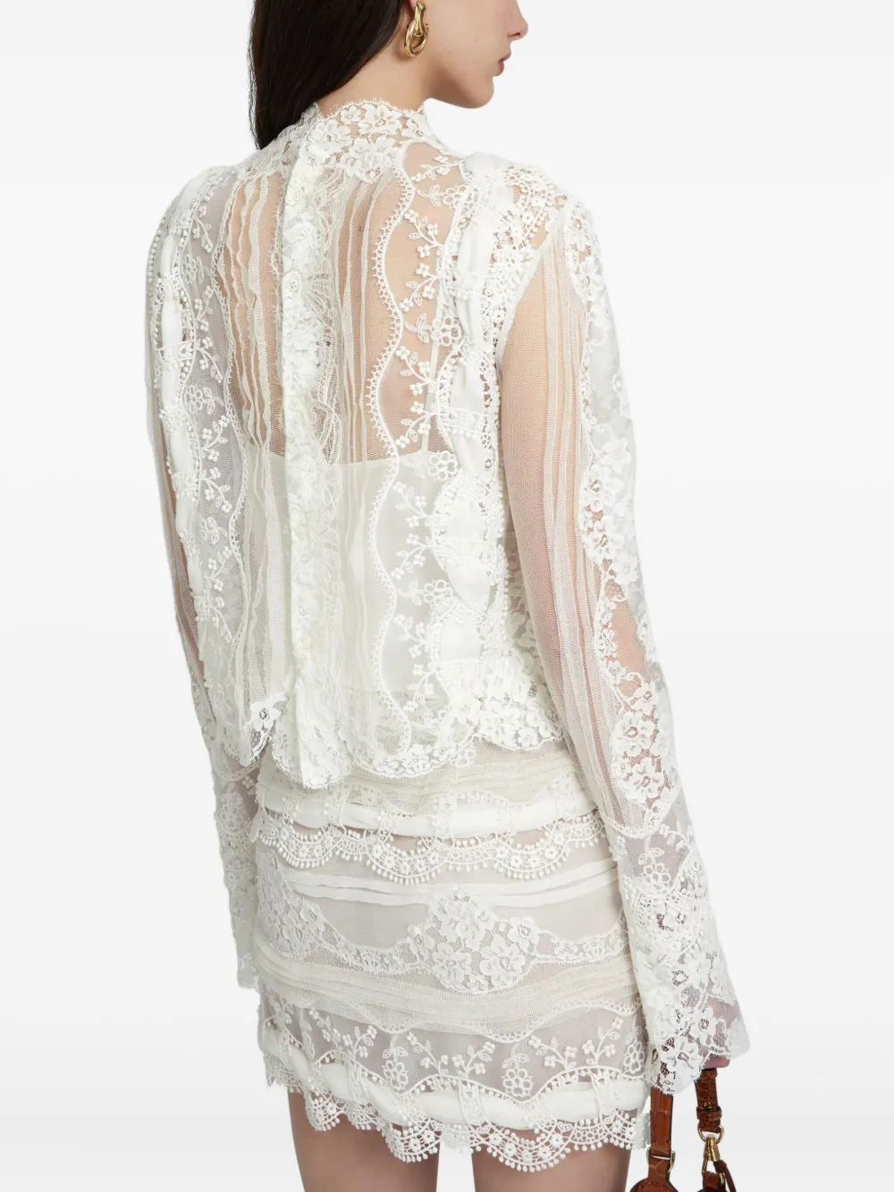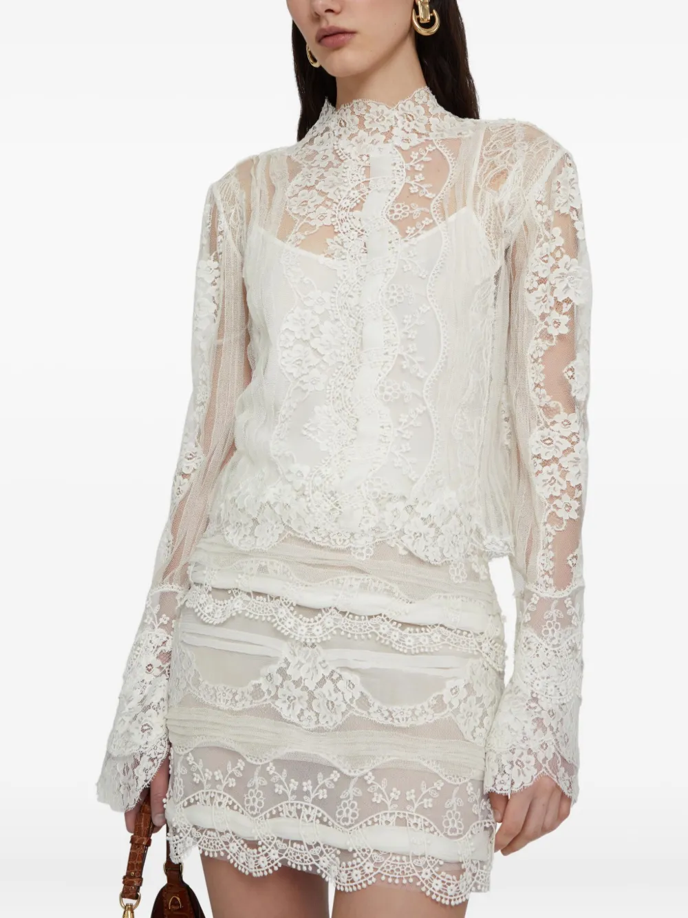 Белое шелковое кружево, вышивка, длинные рукава, потайная застежка спереди.