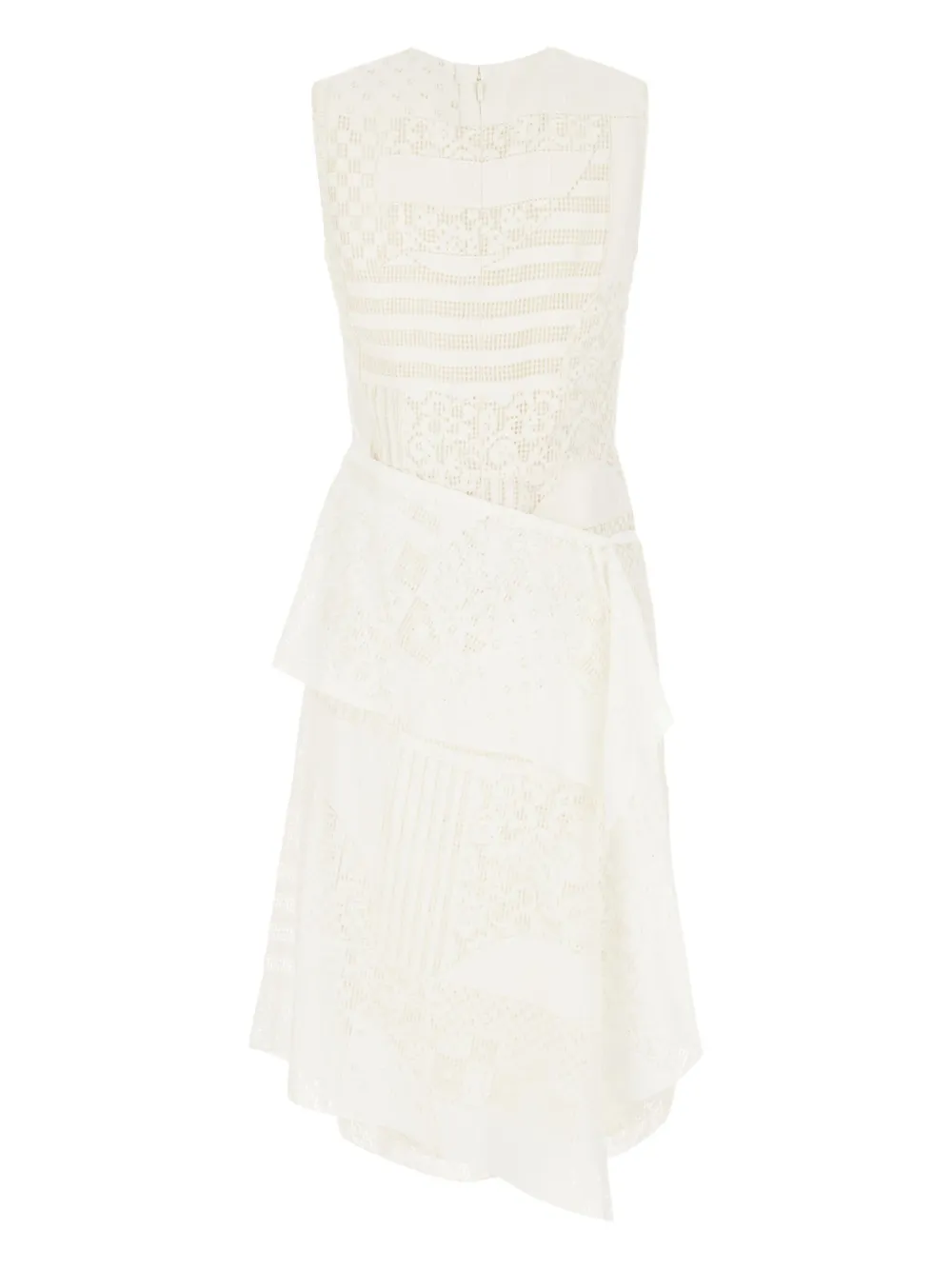 Белоснежные кружевные вставки, без рукавов, круглый вырез, асимметричный подол, оборка сверху