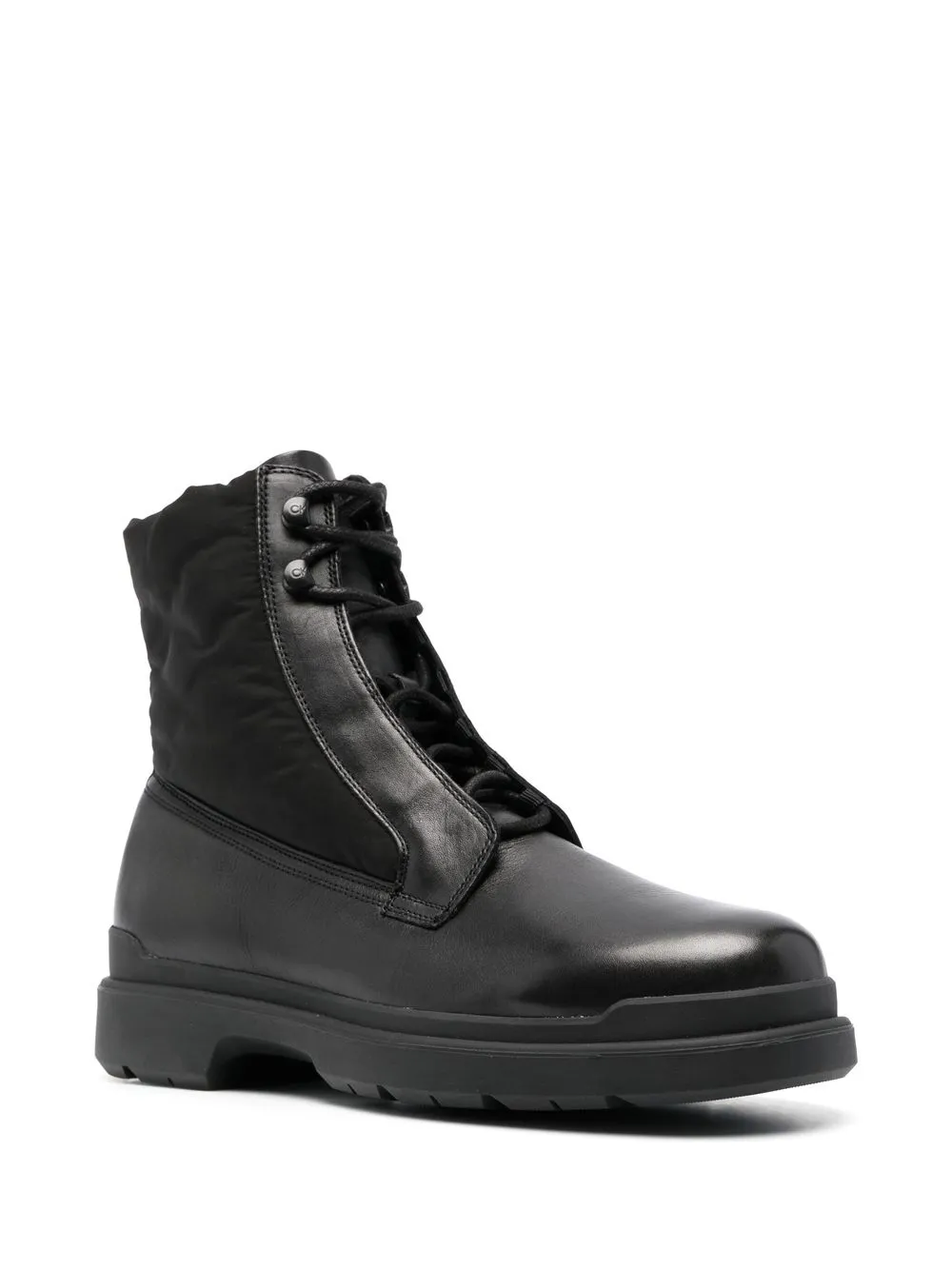 Черный, телячья кожа, дутые вставки, фурнитура в тон, тисненый логотип сзади, стелька с логотипом, закругленный носок, шнуровка спереди, массивная резиновая подошва и высота по щиколотку.