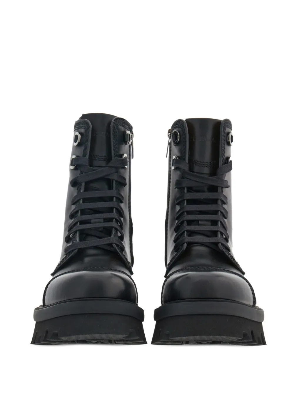 Черный, кожа, гладкая текстура кожи, закругленный носок, шнуровка спереди, застежка на молнии сбоку, высота по щиколотку, низкий блочный каблук и рифленая резиновая подошва.