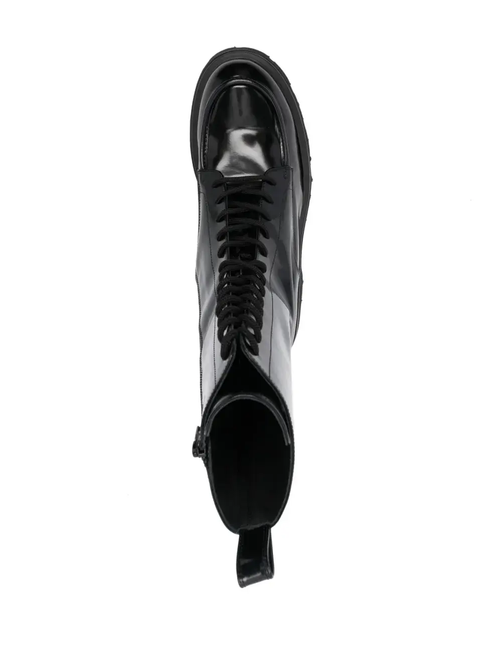 Черный, телячья кожа, высота по щиколотку, тисненый логотип сбоку, петля для подтягивания сзади, шнуровка спереди, застежка на молнии сбоку, закругленный носок и рифленая резиновая подошва.