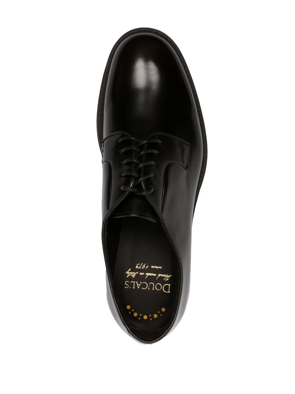 Телячья кожа, глянцевая фактура, закругленный носок, шнуровка спереди, кожаная стелька с логотипом и плоская резиновая подошва.