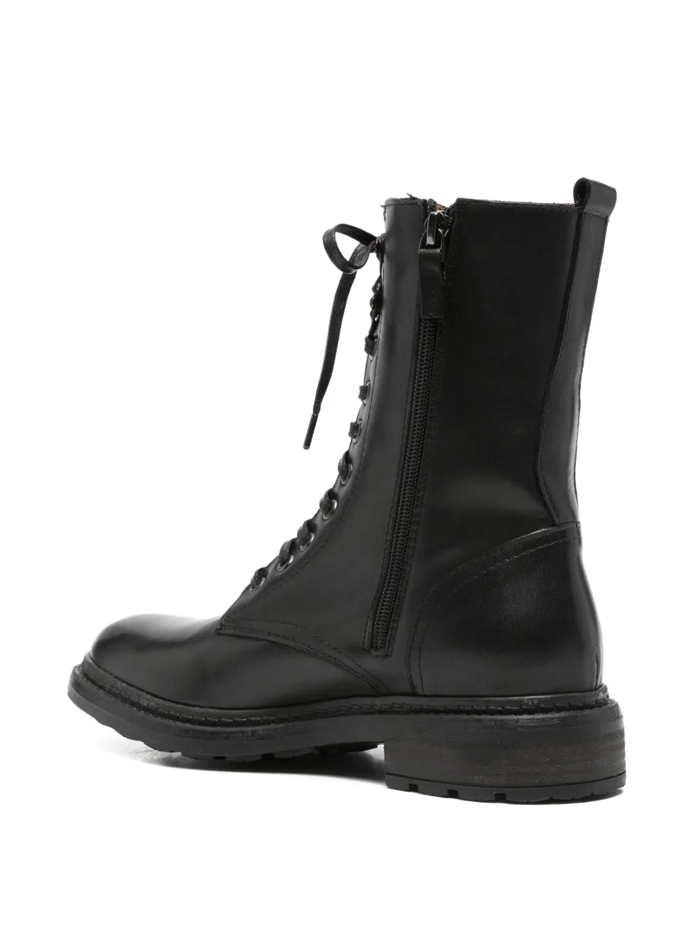 Черная телячья кожа, шнуровка, круглый носок, застежка-молния сбоку.