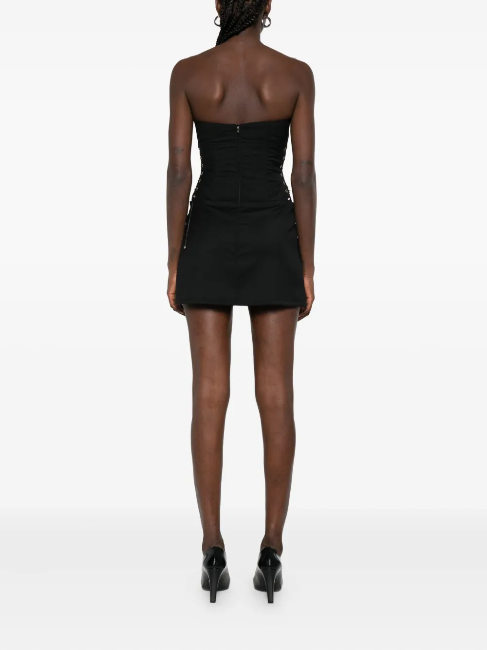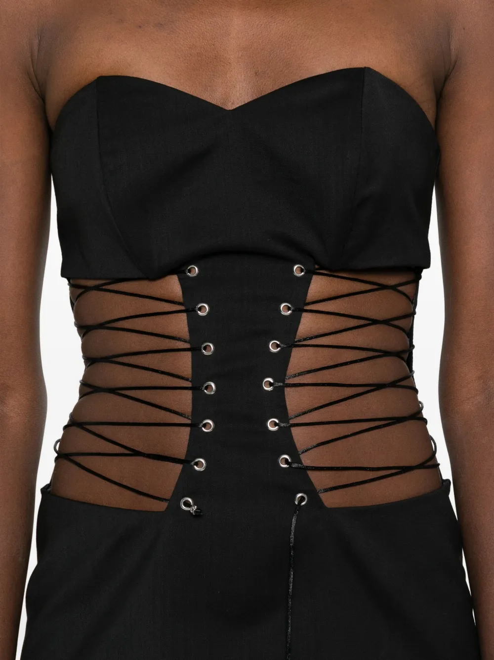 Черный корсет без бретелек со шнуровкой, декорированный люверсами, завязками на талии и юбкой А-силуэта