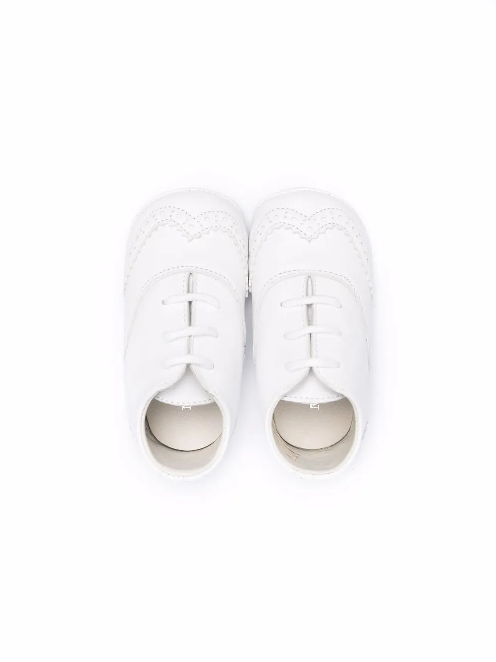 Перфорация, тональная строчка, закругленный носок, шнуровка спереди и плоская подошва. Цвет: белый.